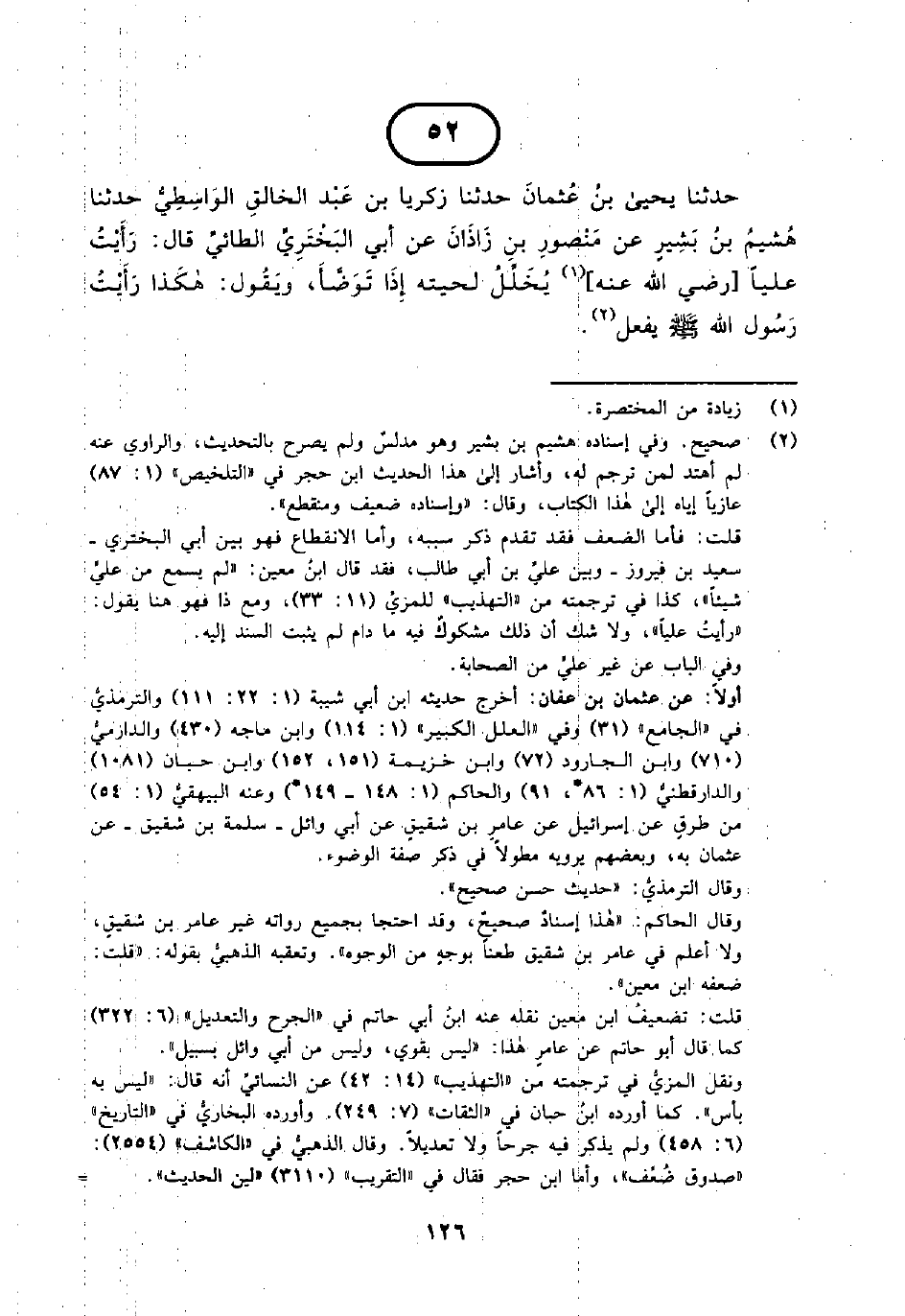 52 - حَدَّثَنَا يَحْيَى بْنُ عُثْمَانَ حَدَّثَنَا زَكَرِيَّا بْنُ عَبْدِ الْخَالِقِ الْوَاسِطِيُّ حَدَّثَنَا هُشَيْمُ بْنُ بَشِيرٍ عَنْ مَنْصُورِ بْنِ زَاذَانَ عَنْ أَبِي الْبَخْتَرِيِّ الطَّائِيِّ قَالَ رَأَيْتُ عَلِيًّا [رَضِيَ اللَّهُ عَنْهُ] يُخَلِّلُ لِحْيَتَهُ إِذَا تَوَضَّأَ وَيَقُولُ هَكَذَا رَأَيْتُ رَسُولُ اللَّهِ صَلَّى اللَّهُ عَلَيْهِ وسلم يفعل.