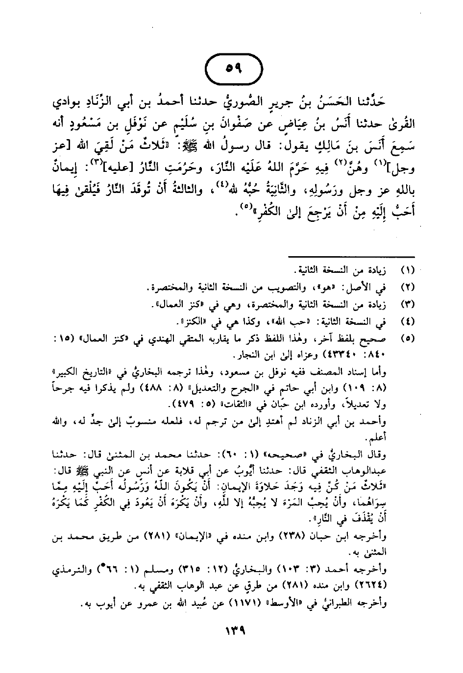 59 - حَدَّثَنَا الْحَسَنُ بْنُ جَرِيرٍ الصُّورِيُّ حَدَّثَنَا أَحْمَدُ بْنُ أَبِي الزِّنَادِ بِوَادِي الْقُرَى حَدَّثَنَا أَنَسُ بْنُ عِيَاضِ عَنْ صَفْوانَ بْنِ سُلَيْمٍ عَنْ نَوْفَلِ بْنِ مَسْعُودٍ أَنَّهُ سَمِعَ أَنَسَ بْنَ مَالِكٍ يَقُولُ قَالَ رَسُولُ اللَّهِ صَلَّى اللَّهُ عَلَيْهِ وَسَلَّمَ ثَلَاثٌ مَنْ لَقِيَ اللَّهَ [عَزَّ وَجَلَّ] وَهُنَّ فِيهِ حَرَّمَ اللَّهُ عَلَيْهِ النَّارَ وحَرُمَتِ النَّارُ [عَلَيْهِ] إِيمَانٌ بِاللَّهِ عَزَّ جل وَرَسُولِهِ وَالثَّانِيَةُ حُبُّهُ لِلَّهِ وَالثَّالِثَةُ أَنْ تُوقَدَ النَّارُ فَيُلْقَى فِيهَا أَحَبُّ إِلَيْهِ مِنْ أَنْ يَرْجِعَ إِلَى الْكُفْرِ.
