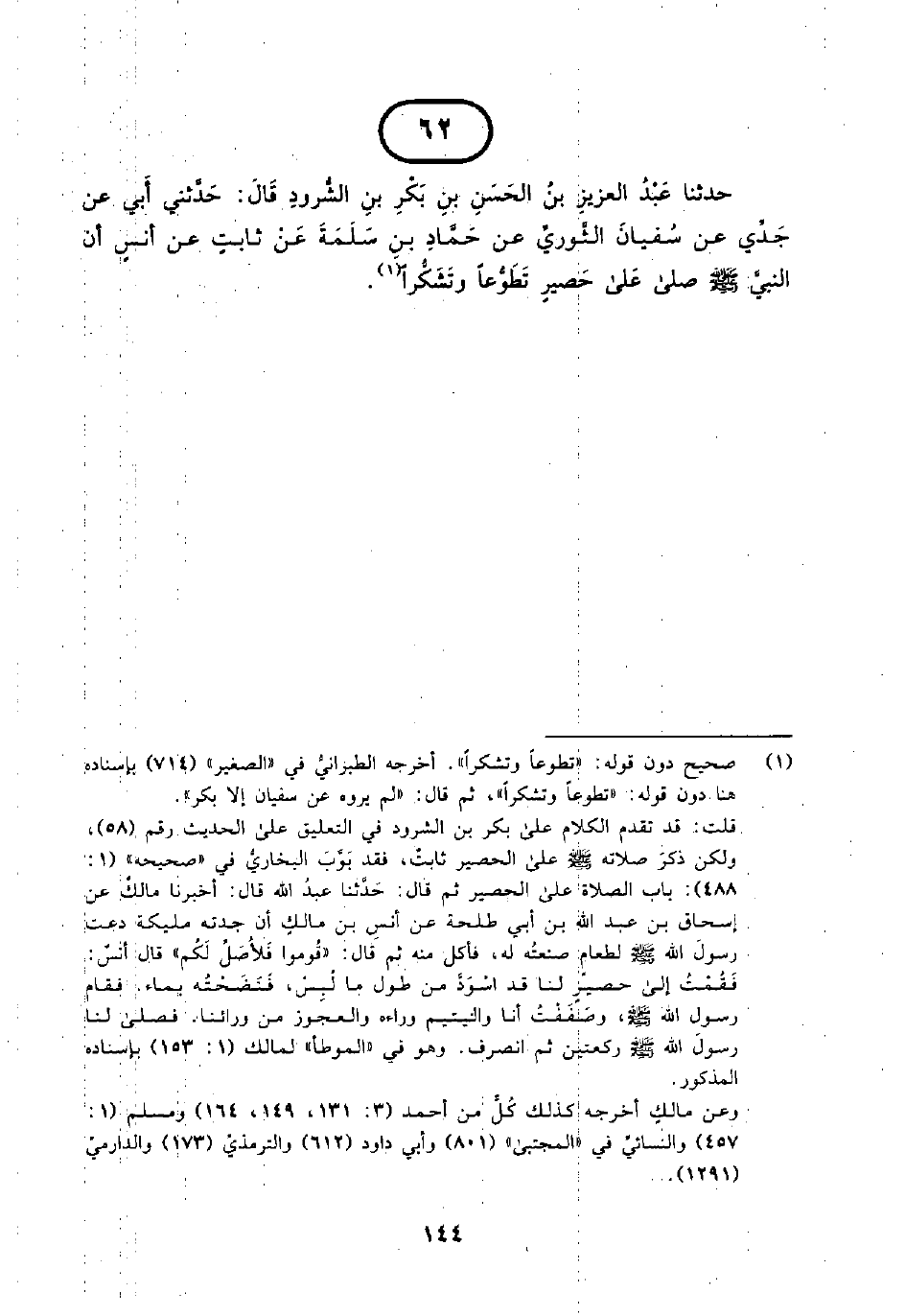 62 - حَدَّثَنَا عَبْدُ الْعَزِيزِ بْنُ الْحَسَنِ بْنِ بَكْرِ بْنِ الشَّرُودِ قَالَ حَدَّثَنِي أَبِي عَنْ جَدِّي عَنْ سُفْيَانَ الثَّوْرِيِّ عَنْ حَمَّادِ بْنِ سَلَمَةَ عَنْ ثَابِتٍ عَنْ أَنَسٍ أَنَّ النَّبِيِّ صَلَّى اللَّهُ عَلَيْهِ وَسَلَّمَ صَلَّى عَلَى حَصِيرٍ تَطَوُّعًا وَتَشَكُّرًا.