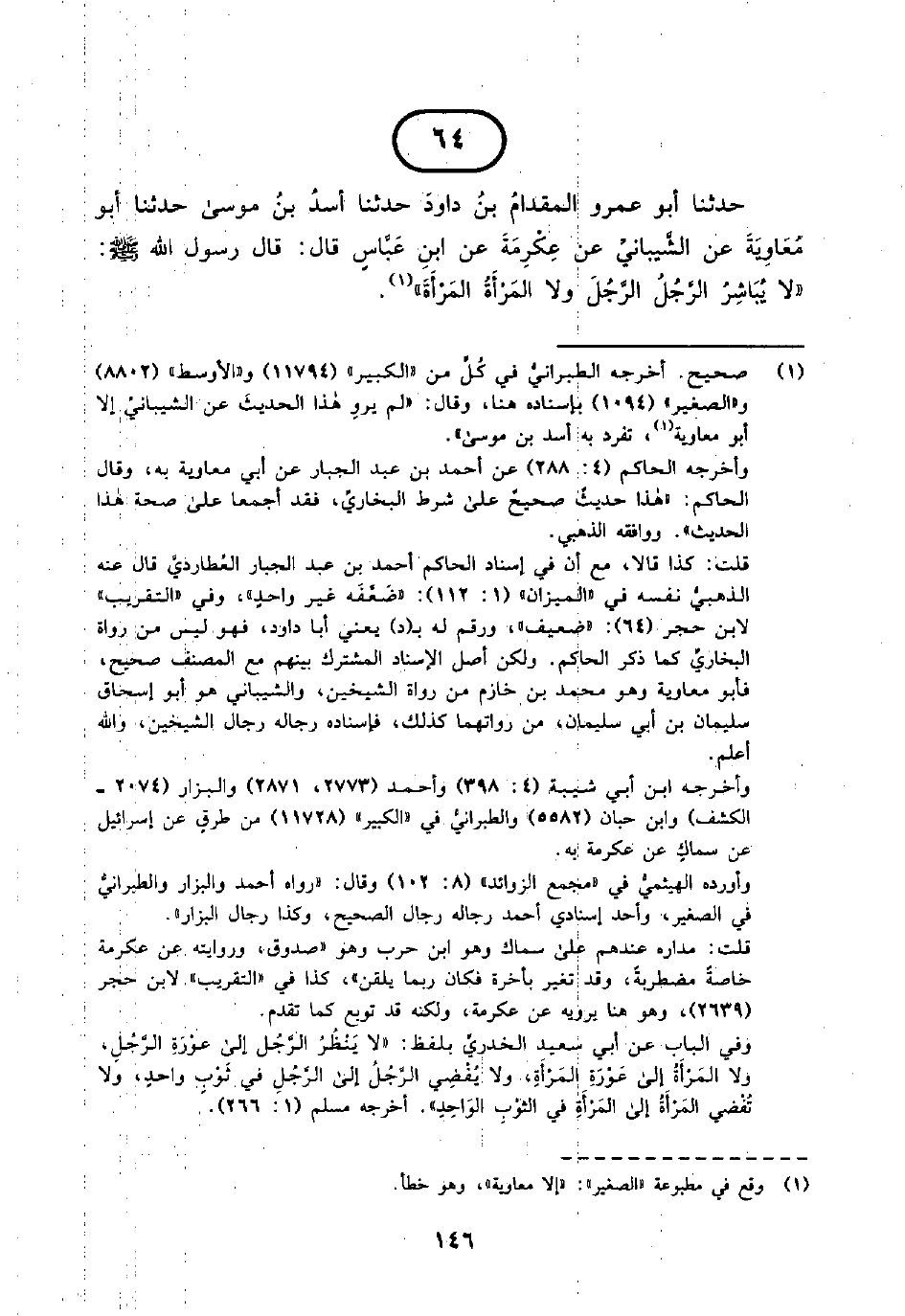 64 - حَدَّثَنَا أَبُو عَمْرٍو الْمِقْدَامُ بْنُ دَاوُدَ حَدَّثَنَا أَسَدُ بْنُ مُوسَى حَدَّثَنَا أبومعاوية عَنِ الشَّيْبَانِيِّ عَنْ عِكْرِمَةَ عَنِ ابْنِ عَبَّاسٍ قَالَ قَالَ رَسُولُ اللَّهِ صَلَّى اللَّهُ عَلَيْهِ وَسَلَّمَ لَا يُبَاشِرُ الرَّجُلُ الرَّجُلَ وَلَا الْمَرْأَةُ الْمَرْأَةَ.