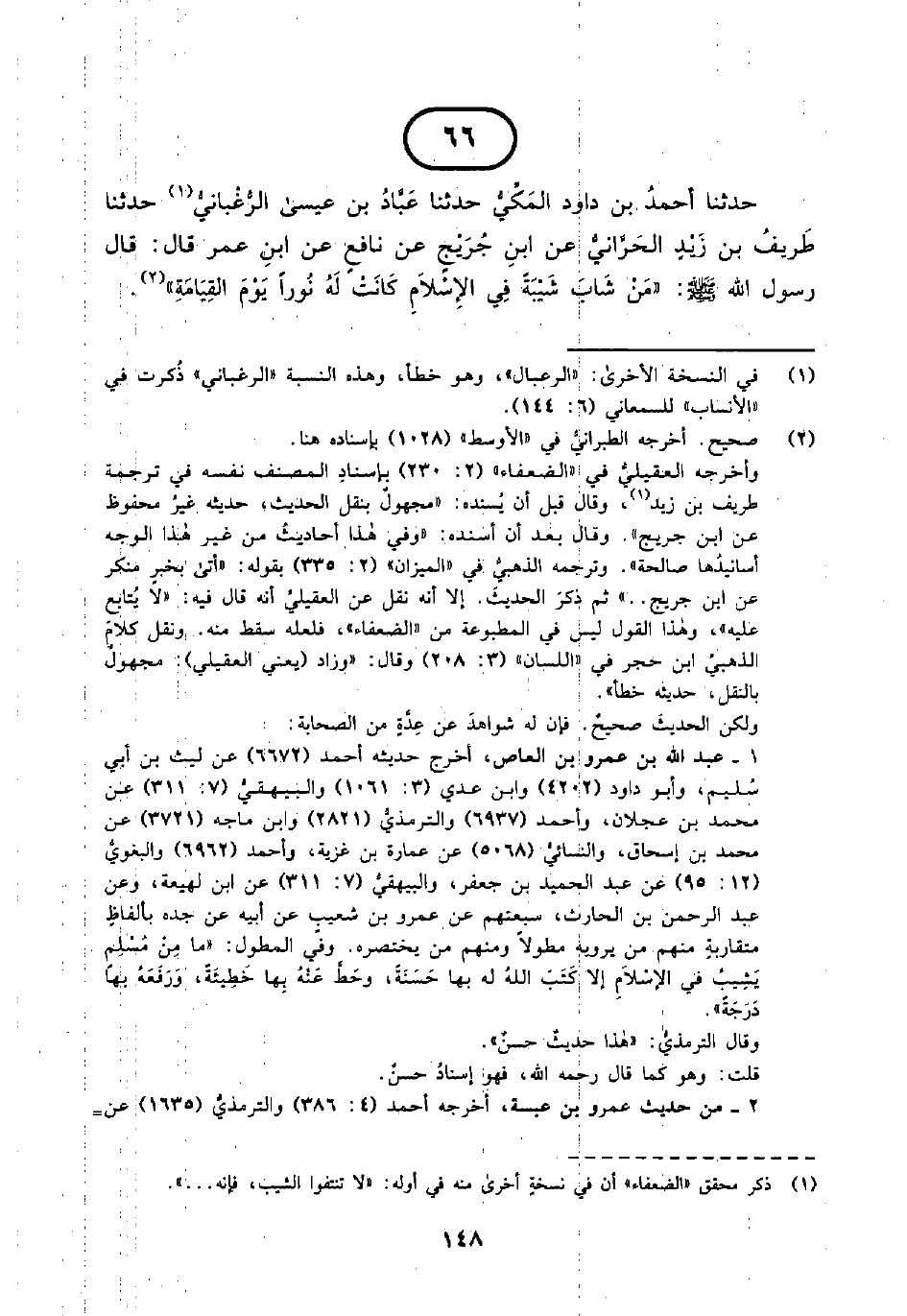 66 - حَدَّثَنَا أَحْمَدُ بْنُ دَاوُدَ الْمَكِّيُّ حَدَّثَنَا عَبَّادُ بْنُ عِيسَى الرُّغْبَانِيُّ حَدَّثَنَا طَرِيفُ بنْ زَيْدٍ الْحَرَّانِيُّ عَنِ ابْنِ جُرَيْجٍ عَنْ نَافِعٍ عَنِ ابْنِ عُمَرَ قَالَ قَالَ رَسُولُ اللَّهِ صَلَّى اللَّهُ عَلَيْهِ وَسَلَّمَ مَنْ شَابَ شَيْبَةً فِي الْإِسْلَامِ كَانَتْ لَهُ نُورًا يَوْمَ الْقِيَامَةِ.
