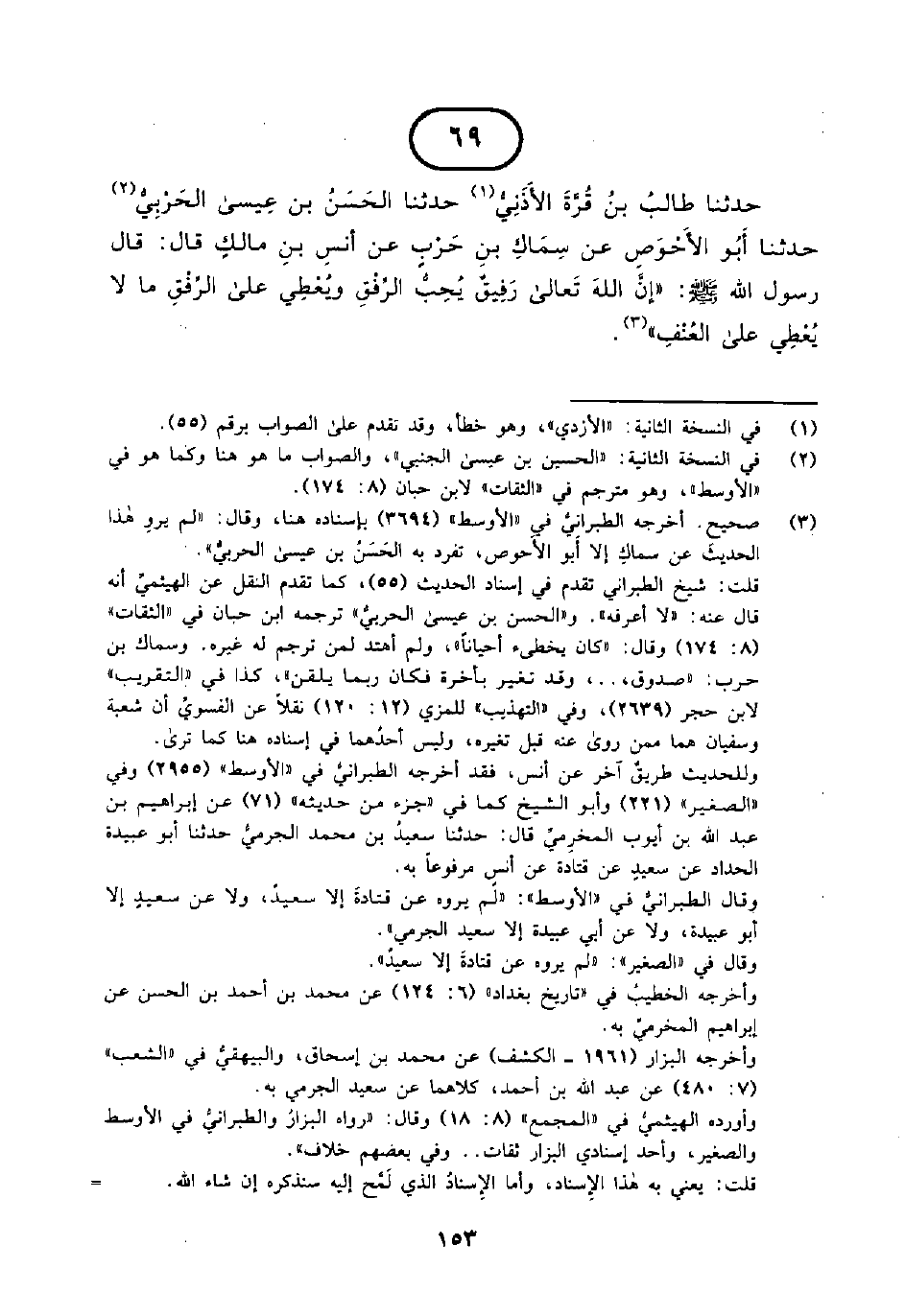 69 - حَدَّثَنَا طَالِبُ بْنُ قُرَّةَ الْأَذَنِيُّ حَدَّثَنَا الْحَسَنُ بْنُ عِيسَى الْحَرْبِيُّ حَدَّثَنَا أَبُو الْأَحْوَصِ عَنْ سِمَاكِ بْنِ حَرْبٍ عَنْ أَنَسِ بْنِ مَالِكٍ قَالَ قَالَ رَسُولُ اللَّهِ صَلَّى اللَّهُ عَلَيْهِ وَسَلَّمَ إِنَّ اللَّهَ تَعَالَى رَفِيقٌ يُحِبُّ الرِّفْقَ وَيُعْطِي عَلَى الرِّفْقِ مَا لَا يُعْطِي عَلَى الْعُنْفِ.