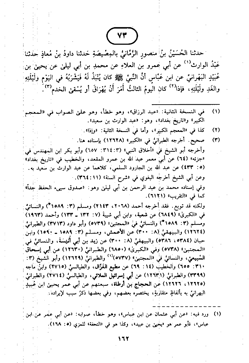 73 - حَدَّثَنَا الْحُسَيْنُ بْنُ مَنْصُورٍ الرُّمَّانِيُّ بِالْمِصِّيصَةِ حَدَّثَنَا دَاوُدُ بْنُ مُعَاذٍ حَدَّثَنَا عَبْدُ الْوَارِثِ عَنْ أَبِي عَمْرِو بْنِ الْعَلَاءِ عَنْ مُحَمَّدِ بْنِ أَبِي لَيْلَى عَنْ يَحْيَى بْنِ عُبَيْدٍ الْبَهْرَانِيِّ عَنِ ابْنِ عَبَّاسٍ أَنَّ النَّبِيَّ صَلَّى اللَّهُ عَلَيْهِ وَسَلَّمَ كَانَ يُنبذ لَهُ فيشرَبُهُ فِي الْيَوْمِ وَلَيْلَتِهِ وَالْغَدِ وَلَيْلَتِهِ فَإِذَا كَانَ الْيَوْمُ الثَّالِثُ أَمَرَ أَنْ يُهْرَاقَ أَوْ يُسْقَى الْخَدَمُ.