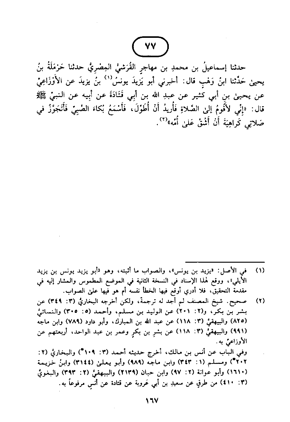 77 - حَدَّثَنَا إِسْمَاعِيلُ بْنُ مُحَمَّدِ بْنِ مُهَاجِرٍ الْقُرَشِيُّ الْمِصْرِيُّ حَدَّثَنَا حَرْمَلَةُ بْنُ يَحْيَى حَدَّثَنَا ابْنُ وَهْبٍ قَالَ أَخْبَرَنِي أَبُو يَزِيدَ يُونُسُ بْنُ يَزِيدَ عَنِ الْأَوْزَاعِيِّ عَنْ يَحْيَى بْنِ أَبِي كَثِيرٍ عَنْ عَبْدِ اللَّهِ بْنِ أَبِي قَتَادَةَ عَنْ أَبِيهِ عَن النَّبِيِّ صَلَّى اللَّهُ عَلَيْهِ وَسَلَّمَ قَالَ إِنِّي لَأَقُومُ إِلَى الصَّلَاةِ فَأُرِيدُ أَنْ أُطَوِّلَ فَأَسْمَعُ بُكَاءَ الصَّبِيِّ فَأَتَجَوَّزُ فِي صَلَاتِي كَرَاهِيَةَ أَنْ أَشُقَّ عَلَى أُمِّهِ.