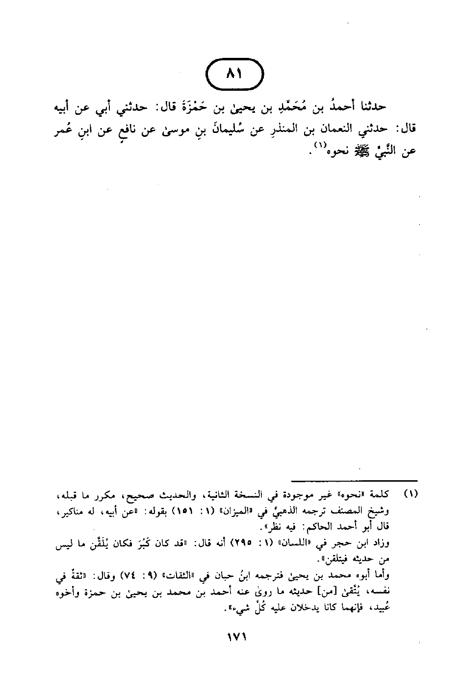 81 - حَدَّثَنَا أَحْمَدُ بْنُ مُحَمَّدِ بْنِ يَحْيَى بْنِ حَمْزَةَ قَالَ حَدَّثَنِي أَبِي عَنْ أَبِيهِ قَالَ حَدَّثَنِي النُّعْمَانُ بْنُ الْمُنْذِرِ عَنْ سُلَيْمَانَ بْنِ مُوسَى عَنْ نَافِعٍ عَنِ ابْنِ عُمَرَ عَنِ النَّبِيِّ صَلَّى اللَّهُ عَلَيْهِ وَسَلَّمَ نَحْوَهُ.