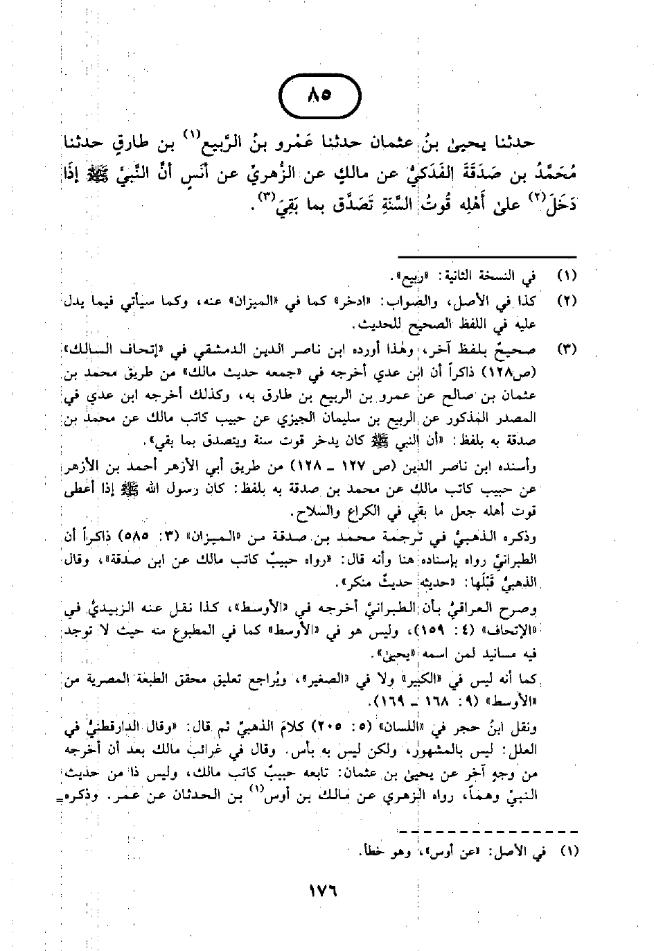 85 - حَدَّثَنَا يَحْيَى بْنُ عُثْمَانَ حَدَّثَنَا عَمْرُو بْنُ الرَّبِيعِ بْنِ طَارِقٍ حَدَّثَنَا مُحَمَّدُ بْنُ صَدَقَةَ الْفَدَكِيُّ عَنْ مَالِكٍ عَنِ الزُّهْرِيِّ عَنْ أَنَسٍ أَنَّ النَّبِيَّ صَلَّى اللَّهُ عَلَيْهِ وَسَلَّمَ إِذَا دَخَلَ عَلَى أَهْلِهِ قُوتُ السَّنَةِ تَصَدَّقَ بِمَا بَقِيَ.