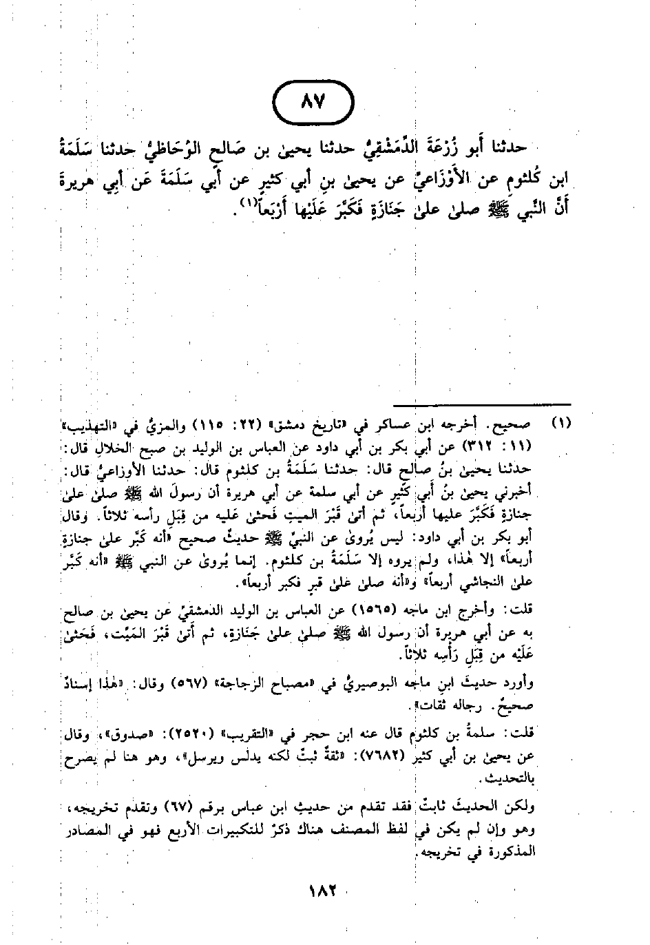 87 - حَدَّثَنَا أَبُو زُرْعَةَ الدِّمَشْقِيُّ حَدَّثَنَا يَحْيَى بْنُ صَالِحٍ الْوُحَاظِيُّ حَدَّثَنَا سَلَمَةُ بْنُ كُلْثُومٍ عَنِ الْأَوْزَاعِيِّ عَنْ يَحْيَى بْنِ أَبِي كَثِيرٍ عَنْ أَبِي سَلَمَةَ عَنْ أَبِي هُرَيْرَةَ أَنّ النَّبِيَّ صَلَّى اللَّهُ عَلَيْهِ وَسَلَّمَ صَلَّى عَلَى جَنَازَةٍ فَكَبَّرَ عَلَيْهَا أَرْبَعًا.
