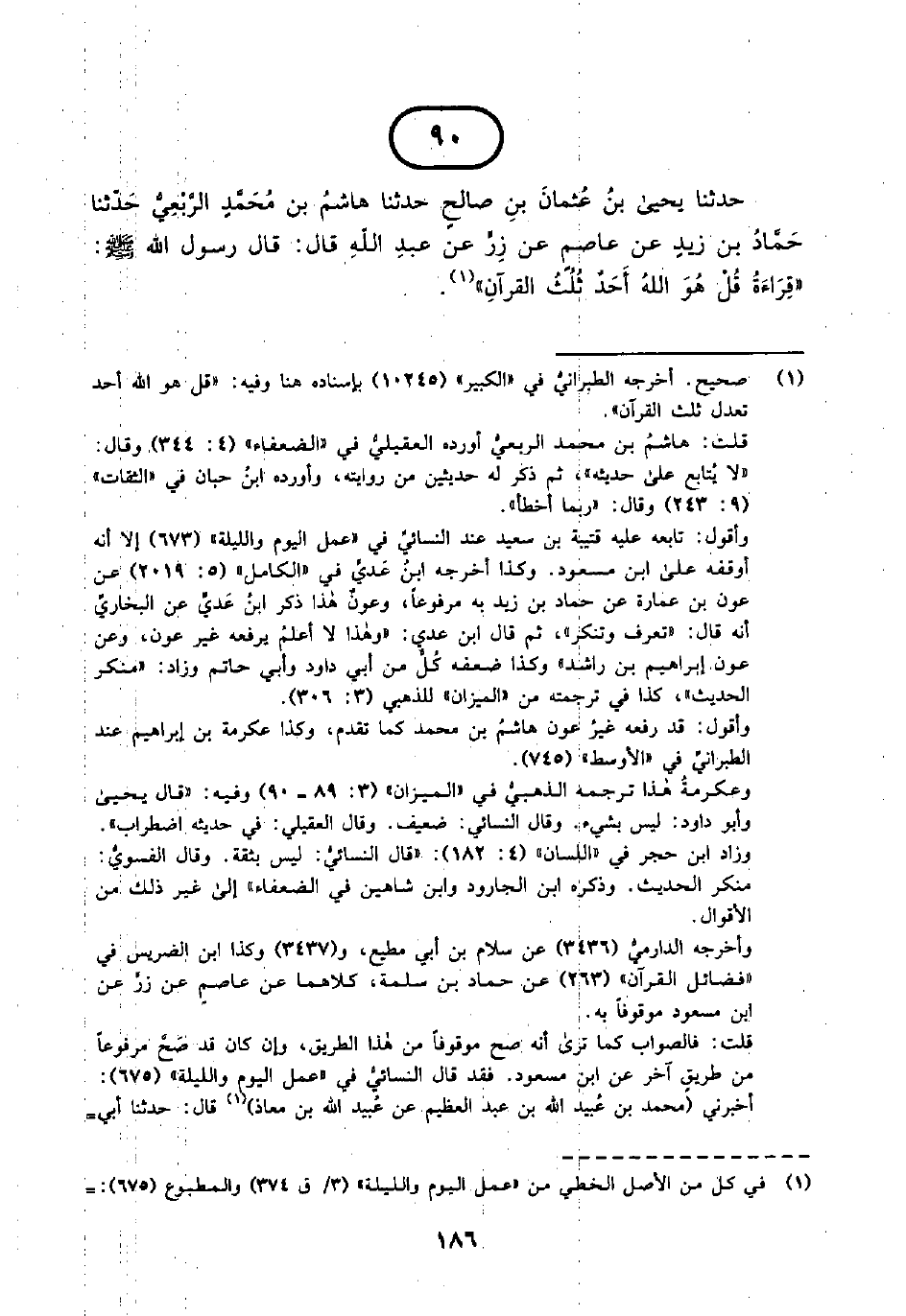 90 - حَدَّثَنَا يَحْيَى بْنُ عُثْمَانَ بْنِ صَالِحٍ حَدَّثَنَا هَاشِمُ بْنُ مُحَمَّدٍ الرِّبْعِيُّ حَدَّثَنَا حَمَّادُ بْنُ زَيْدٍ عَنْ عَاصِمٍ عَنْ زِرٍّ عَنْ عَبْدِ اللَّهِ قَالَ قَالَ رَسُولُ اللَّهِ صَلَّى اللَّهُ عَلَيْهِ وَسَلَّمَ قِرَاءَةُ قُلْ هُوَ اللَّهُ أَحَدٌ ثُلُثُ الْقُرْآنِ.