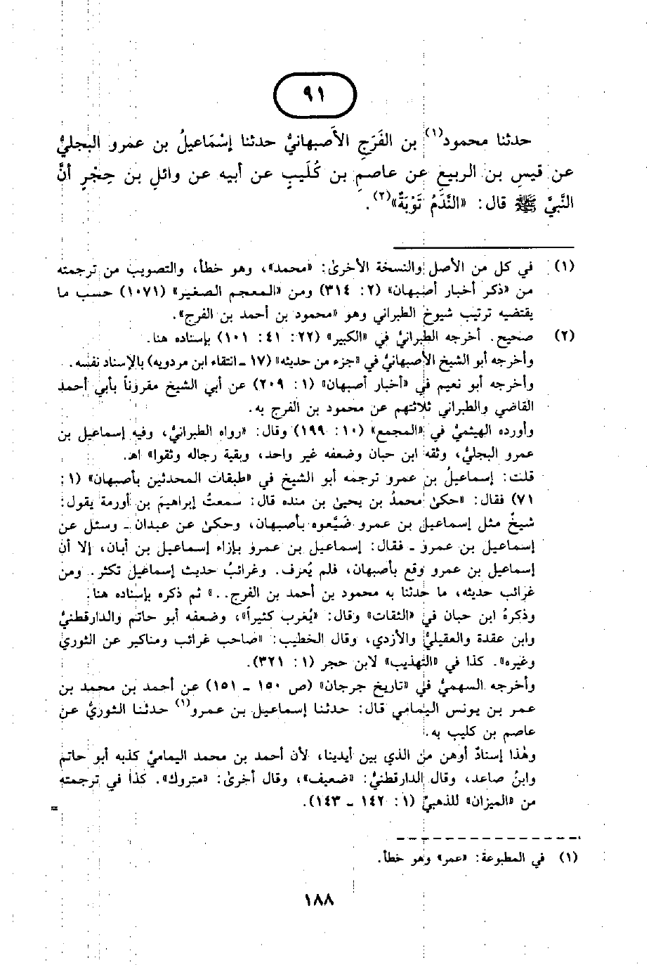 91 - حَدَّثَنَا مَحْمُودُ بْنُ الْفَرَجِ الْأَصْبَهَانِيُّ حَدَّثَنَا إِسْمَاعِيلُ بْنُ عَمْرٍو الْبَجَلِيُّ عَنْ قَيْسِ بْنِ الرَّبِيعِ عَنْ عَاصِمِ بْنِ كُلَيْبٍ عَنْ أَبِيهِ عَنْ وَائِلِ بْنِ حِجْرٍ أَنّ النَّبِيَّ صَلَّى اللَّهُ عَلَيْهِ وَسَلَّمَ قَالَ النَّدَمُ تَوْبَةٌ.