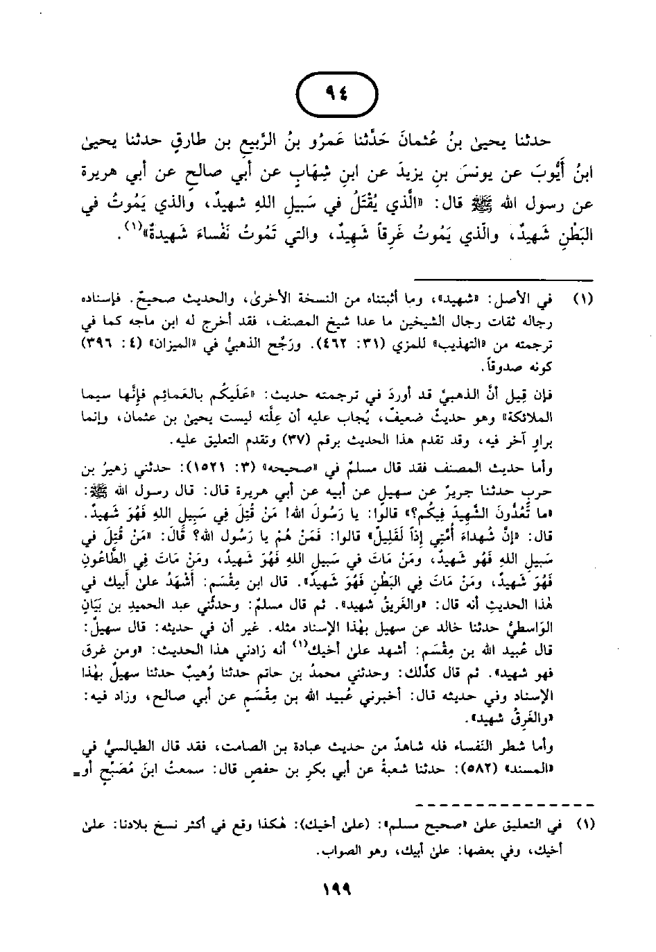 94 - حَدَّثَنَا يَحْيَى بْنُ عُثْمَانَ بْنِ حَدَّثَنَا عَمْرُو بْنُ الرَّبِيعِ بْنِ طَارِقٍ حَدَّثَنَا يَحْيَى بْنُ أَيُّوبَ عَنْ يُونُسَ بْنِ يَزِيدَ عَنِ ابْنِ شِهَابٍ عَنْ أَبِي صَالِحٍ عَنْ أَبِي هُرَيْرَةَ عَنْ رَسُولِ اللَّهِ صَلَّى اللَّهُ عَلَيْهِ وَسَلَّمَ قَالَ الَّذِي يُقْتَلُ فِي سَبِيلِ اللَّهِ شَهِيدٌ وَالَّذِي يَمُوتُ فِي الْبَطْنِ شَهِيدٌ وَالَّذِي يَمُوتُ غَرِقًا شَهِيدٌ وَالَّتِي تَمُوتُ نَفْسَاءَ شَهِيدَةٌ.