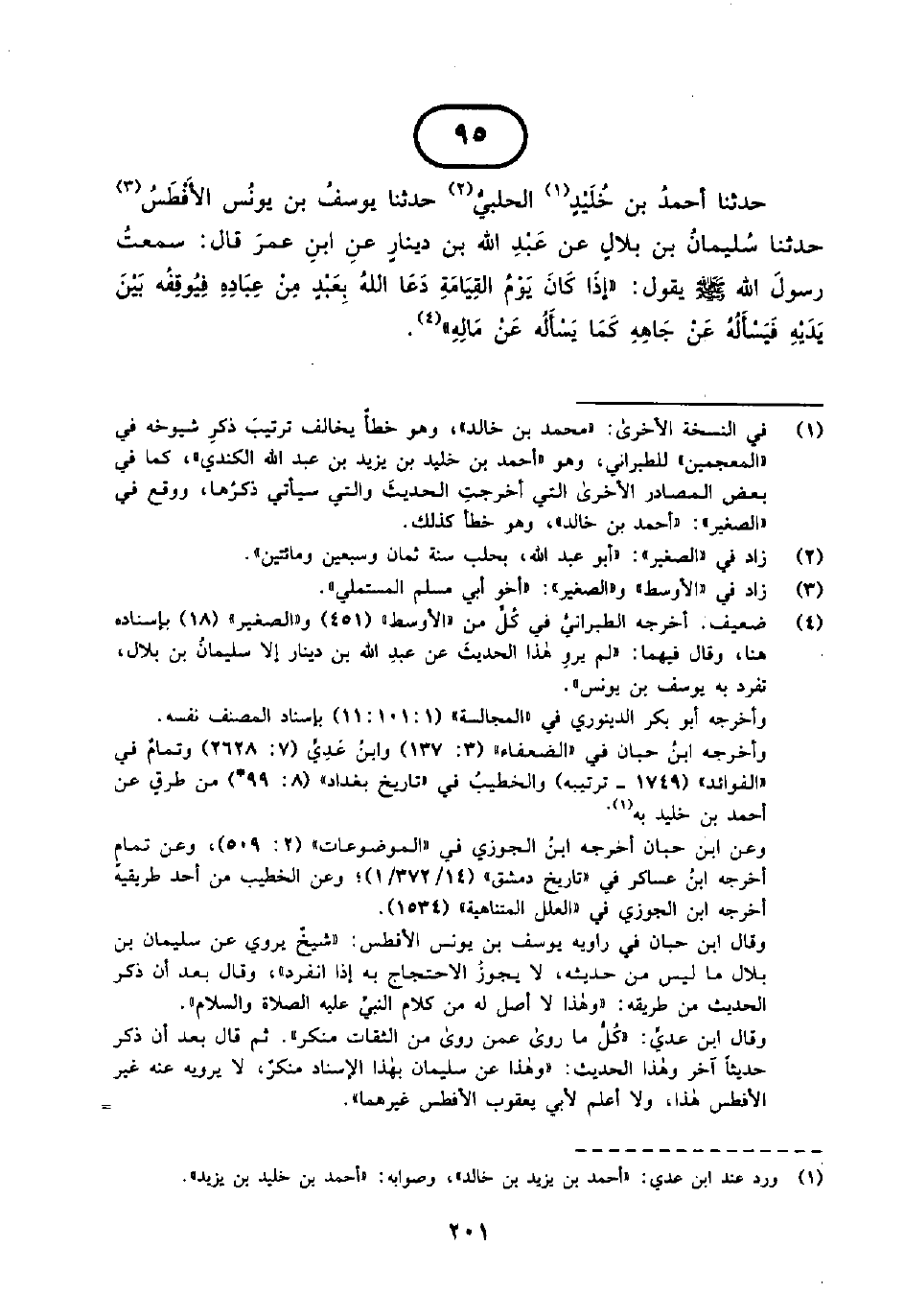 95 - حَدَّثَنَا أَحْمَدُ بْنُ خُلَيْدٍ الْحَلَبِيُّ حَدَّثَنَا يُوسُفُ بْنُ يُونُسَ الْأَفْطَسُ حَدَّثَنَا سليمان بن بلال عَنْ عَبْدِ اللَّهِ بْنِ دِينَارٍ عَنِ ابْنِ عُمَرَ قَالَ سَمِعْتُ رَسُولُ اللَّهِ صَلَّى اللَّهُ عَلَيْهِ وَسَلَّمَ يَقُولُ إِذَا كَانَ يَوْمُ الْقِيَامَةِ دَعَا اللَّهُ بِعَبْدٍ مِنْ عِبَادِهِ فَيُوقِفُهُ بَيْنَ يَدَيْهِ فَيَسْأَلُهُ عَنْ جَاهِهِ كَمَا يَسْأَلُهُ عَنْ مَالِهِ.