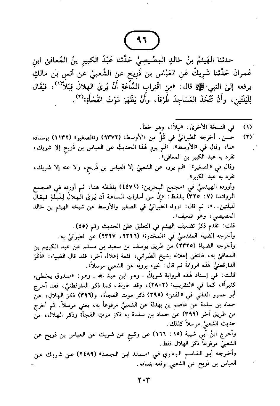 96 - حَدَّثَنَا الْهَيْثَمُ بْنُ خَالِدٍ الْمِصِّيصِيُّ حَدَّثَنَا عَبْدُ الْكَبِيرِ بْنُ الْمُعَافَى ابن عِمْرَانَ حَدَّثَنَا شَرِيكٌ عَنِ الْعَبَّاسِ بْنِ ذَرِيحٍ عَنِ الشَّعْبِيِّ عَنْ أَنَسِ بْنِ مَالِكٍ يَرْفَعُهُ إِلَى النَّبِيِّ صَلَّى اللَّهُ عَلَيْهِ وَسَلَّمَ قَالَ مِنِ اقْتِرَابِ السَّاعَةِ أَنْ يُرَى الْهِلَالُ قِبَلًا فَيُقَالُ لِلَيْلَتَيْنِ وَأَنْ تُتَّخَذَ الْمَسَاجِدُ طُرُقًا وَأَنْ يَظْهَرَ مَوْتُ الْفُجْأَةِ.