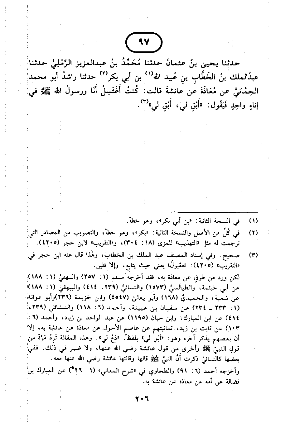 97 - حَدَّثَنَا يَحْيَى بْنُ عُثْمَانَ حَدَّثَنَا مُحَمَّدُ بْنُ عَبْدِ الْعَزِيزِ الرَّمْلِيُّ حَدَّثَنَا عَبْدُ الْمَلِكِ بْنُ الْخَطَّابِ بْنِ عُبَيْدِ اللَّهِ بْنِ أَبِي بَكْرٍ حَدَّثَنَا رَاشِدُ أَبُو مُحَمَّدٍ الْحِمَّانِيُّ عَنْ مُعَاذَةَ عَنْ عَائِشَةَ قالت كنت أغتسل أنا وسول اللَّهِ صَلَّى اللَّهُ عَلَيْهِ وَسَلَّمَ فِي إِنَاءٍ وَاحِدٍ فَيْقُولُ أَبْقِ لِي أَبْقِ لِي.