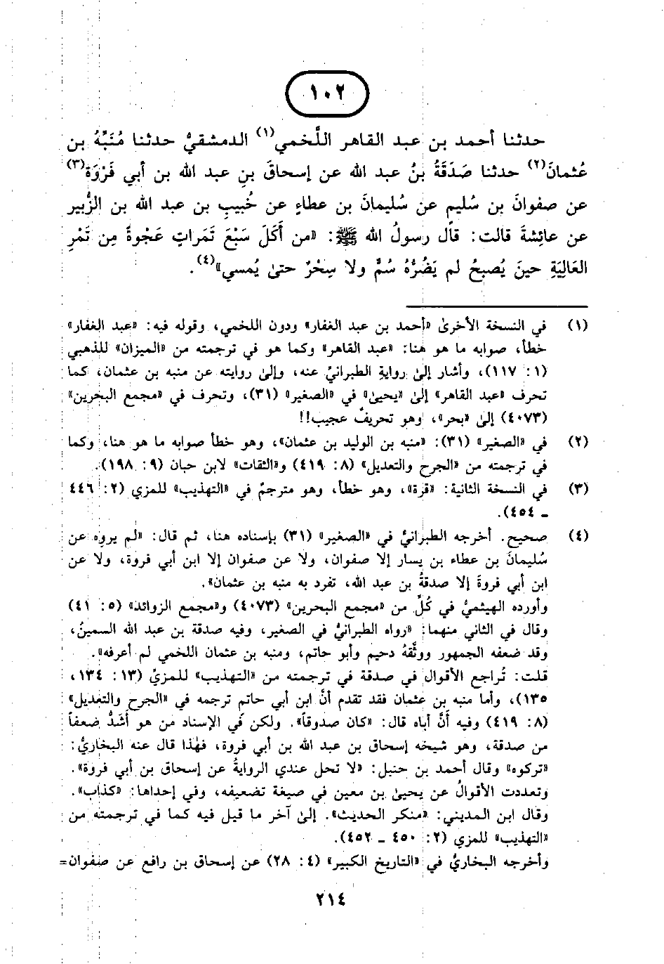 102 - حَدَّثَنَا أَحْمَدُ بْنُ عَبْدِ الْقَاهِرِ اللَّخْمِيُّ الدِّمَشْقِيُّ حَدَّثَنَا مُنَبِّهُ بْنُ عُثْمَانَ حَدَّثَنَا صَدَقَةُ بْنُ عَبْدِ اللَّهِ عَنْ إِسْحَاقَ بْنِ عَبْدِ اللَّهِ بْنِ أَبِي فَرْوَةَ عَنْ صَفْوَانَ بْنِ سُلَيْمٍ عَنْ سُلَيْمَانَ بْنِ عَطَاءٍ عَنْ خُبَيْبِ بْنِ عَبْدِ اللَّهِ بْنِ الزُّبَيْرِ عَنْ عَائِشَةَ قَالَتْ قَالَ رَسُولُ اللَّهِ صَلَّى اللَّهُ عَلَيْهِ وَسَلَّمَ مَنْ أَكَلَ سَبْعَ تَمَرَاتٍ عَجْوةً مِنْ تَمْرِ الْعَالِيَةِ حِينَ يُصْبِحُ لَمْ يَضُرَّهُ سُمٌّ وَلَا سِحْرٌ حَتَّى يُمْسِيَ.