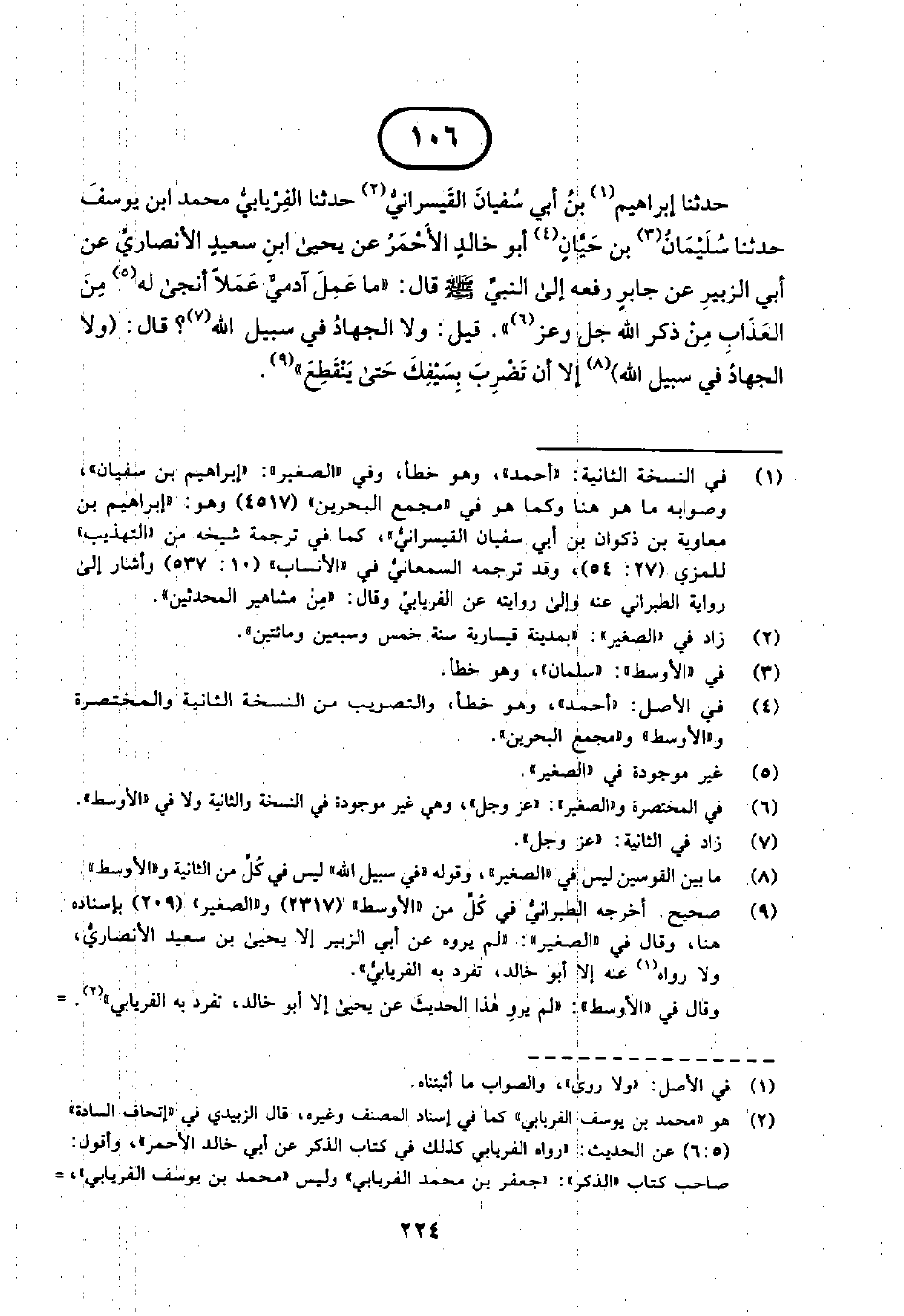 106 - حَدَّثَنَا إِبْرَاهِيمُ بْنُ أَبِي سُفْيَانَ الْقَيْسَرَانِيُّ حَدَّثَنَا الْفِرْيَابِيُّ مُحَمَّدُ بْنُ يُوسُفَ حَدَّثَنَا سُلَيْمَانُ بْنُ حَيَّانَ أَبُو خَالِدٍ الْأَحْمَرُ عَنْ يَحْيَى بْنِ سَعِيدٍ الْأَنْصَارِيِّ عَنْ أَبِي الزُّبَيْرِ عَنْ جَابِرٍ رَفَعَهُ إِلَى النَّبِيِّ صَلَّى اللَّهُ عَلَيْهِ وَسَلَّمَ قَالَ مَا عَمِلَ آدَمِيٌّ عَمَلًا أَنْجَى لَهُ مِنَ الْعَذَابِ مِنْ ذِكْرِ اللَّهِ جَلَّ وَعَزَّ قِيلَ وَلَا الْجِهَادُ فِي سَبِيلِ اللَّهِ قَالَ وَلَا الْجِهَادُ فِي سَبِيلِ اللَّهِ إِلَّا أَنْ تَضْرِبَ بِسَيْفِكَ حَتَّى يَنْقَطِعَ.