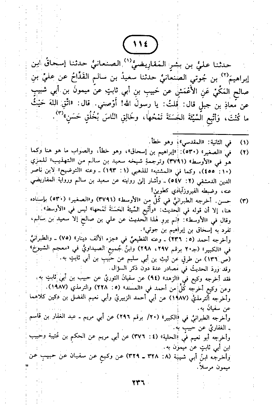 114 - حَدَّثَنَا عَلِيُّ بْنُ بِشْرٍ الْمَقَارِيضِيُّ الصَّنْعَانِيُّ حَدَّثَنَا إِسْحَاقُ بْنُ إِبْرَاهِيمَ بْنِ جُوتِيٍّ الصَّنْعَانِيُّ حَدَّثَنَا سَعِيدُ بْنُ سَالِمٍ الْقَدَّاحُ عَنْ عَلِيِّ بْنِ صَالِحٍ الْمَكِّيِّ عَنِ الْأَعْمَشِ عَنْ حَبِيبِ بْنِ أَبِي ثَابِتٍ عَنْ مَيْمُونِ بْنَ أَبِي شَبِيبٍ عَنْ مُعَاذِ بْنِ جَبَلٍ قَالَ قُلْتُ يَا رَسُولَ اللَّهِ أَوْصِنِي قَالَ اتَّقِ اللَّهَ حَيْثُ مَا كُنْتَ وَأتْبِعِ السَّيِّئَةَ الْحَسَنَةَ تَمْحُهَا وَخَالِقِ النَّاسَ بِخُلُقٍ حَسَنٍ.