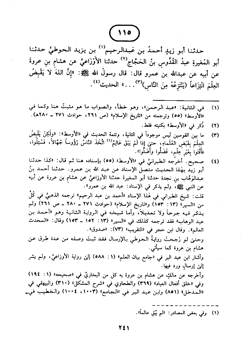 115 - حَدَّثَنَا أَبُو زَيْدٍ أَحْمَدُ بْنُ عَبْدِ الرَّحِيمِ بْنِ يَزِيدَ الْحَوْطِيُّ حَدَّثَنَا أَبُو الْمُغِيرَةِ عَبْدُ الْقُدُّوسِ بْنُ الْحَجَّاجِ حَدَّثَنَا الْأَوْزَاعِيُّ عَنْ هِشَامِ بْنِ عُرْوَةَ عَنْ أَبِيهِ عَنْ عَبْدِ اللَّهِ بْنِ عَمْرٍو قَالَ قَالَ رَسُولُ اللَّهِ صَلَّى اللَّهُ عَلَيْهِ وَسَلَّمَ إِنَّ اللَّهَ لَا يَقْبِضُ الْعِلْمَ انْتِزَاعًا (يَنْتَزِعُهُ مِنَ النَّاسِ). . . الْحَدِيثَ.