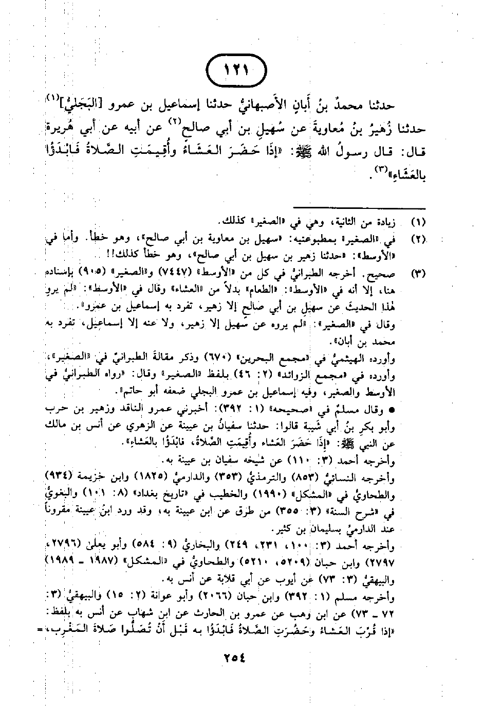 121 - حَدَّثَنَا مُحَمَّدُ بْنُ أَبَانَ الْأَصْبَهَانِيُّ حَدَّثَنَا إِسْمَاعِيلُ بْنُ عَمْرٍو [الْبَجَلِيُّ] حَدَّثَنَا زُهَيْرُ بْنُ مُعَاوِيَةَ عَنْ سُهَيْلِ بْنِ أَبِي صَالِحٍ عَنْ أَبِيهِ عَنْ أَبِي هُرَيْرَةَ قَالَ قَالَ رَسُولُ اللَّهِ صَلَّى اللَّهُ عَلَيْهِ وَسَلَّمَ إِذَا حَضَرَ الْعَشَاءُ وأقيمت الصلاة فابدؤا بِالْعَشَاءِ.