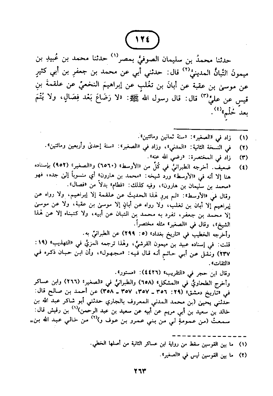 124 - حَدَّثَنَا مُحَمَّدُ بْنُ سُلَيْمَانَ الصُّوفِيُّ بِمِصْرَ حَدَّثَنَا مُحَمَّدُ بْنُ عُبَيْدِ بْنِ مَيْمُونٍ التَّبَّانُّ الْمَدِينِيُّ قَالَ حَدَّثَنِي أَبِي عَنْ مُحَمَّدِ بْنِ جَعْفَرِ بْنِ أَبِي كَثِيرٍ عَنْ مُوسَى بْنِ عُقْبَةَ عَنْ أَبَانَ بْنِ تَغْلِبَ عَنْ إِبْرَاهِيمَ النَّخْعِيِّ عَنْ عَلْقَمَةَ بْنِ قَيْسٍ عَنْ عَلِيٍّ قَالَ قَالَ رَسُولُ اللَّهِ صَلَّى اللَّهُ عَلَيْهِ وَسَلَّمَ لْا رَضَاعَ بَعْدَ فِصَالٍ وَلَا يُتْمَ بَعْدَ حُلْمٍ.