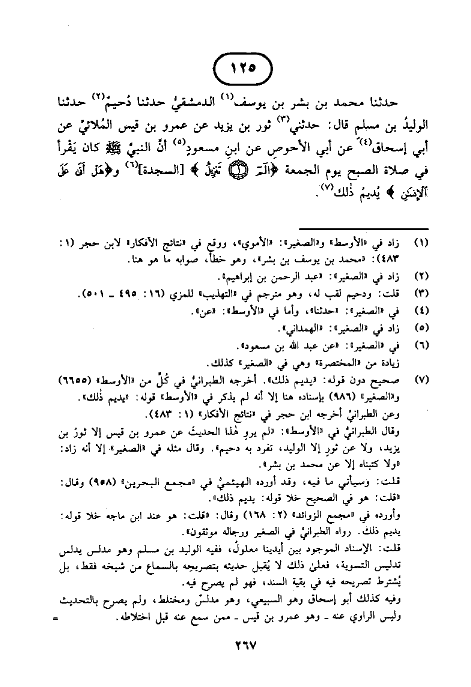 125 - حَدَّثَنَا مُحَمَّدُ بْنُ بِشْرِ بْنِ يُوسُفَ الدِّمَشْقِيُّ حَدَّثَنَا دُحَيْمٌ حَدَّثَنَا الْوَلِيدُ بْنُ مُسْلِمٍ قَالَ حَدَّثَنِي ثَوْرُ بْنُ يَزِيدَ عَنْ عَمْرِو بْنِ قَيْسٍ الْمُلَائِيِّ عَنْ أَبِي إِسْحَاقَ عَنْ أَبِي الْأَحْوَصِ عَنِ ابْنِ مَسْعُودٍ أَنَّ النَّبِيَّ صَلَّى اللَّهُ عَلَيْهِ وَسَلَّمَ كَانَ يَقْرَأُ فِي صَلَاةِ الصُّبْحِ يَوْمَ الْجُمُعَةِ: {الم، تنزيل} [السجدة] و: {هل أتى على الإنسان} يُدِيمُ ذَلِكَ.