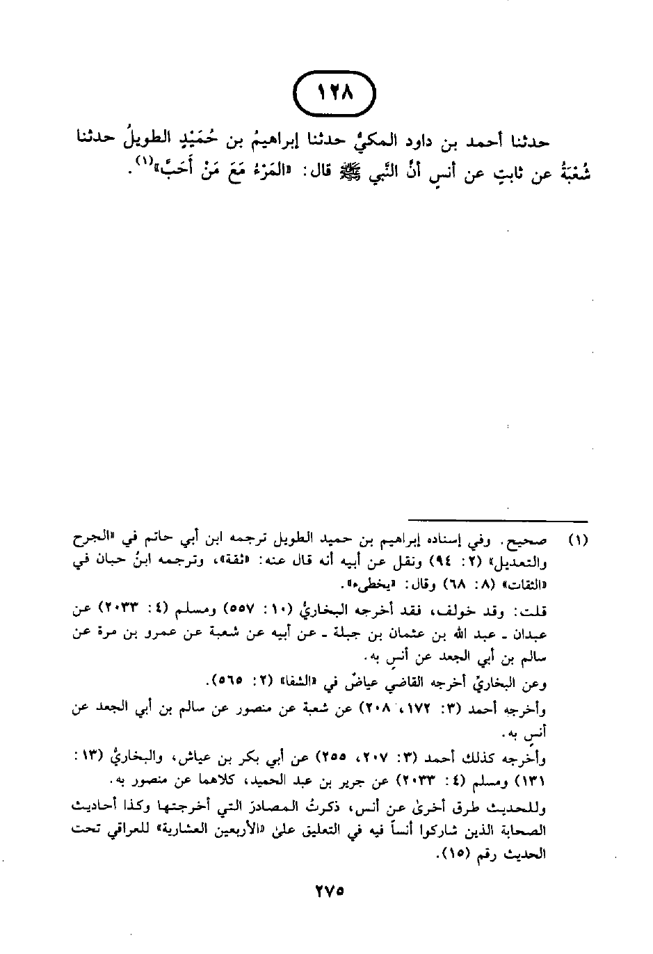 128 - حَدَّثَنَا أَحْمَدُ بْنُ دَاوُدَ الْمَكِّيُّ حَدَّثَنَا إِبْرَاهِيمُ بْنُ حُمَيْدٍ الطَّوِيلُ حَدَّثَنَا شُعْبَةُ عَنْ ثَابِتٍ عَنْ أَنَسٍ أَنَّ النَّبِيَّ صَلَّى اللَّهُ عَلَيْهِ وَسَلَّمَ قَالَ الْمَرْءُ مَعَ مَنْ أَحَبَّ.