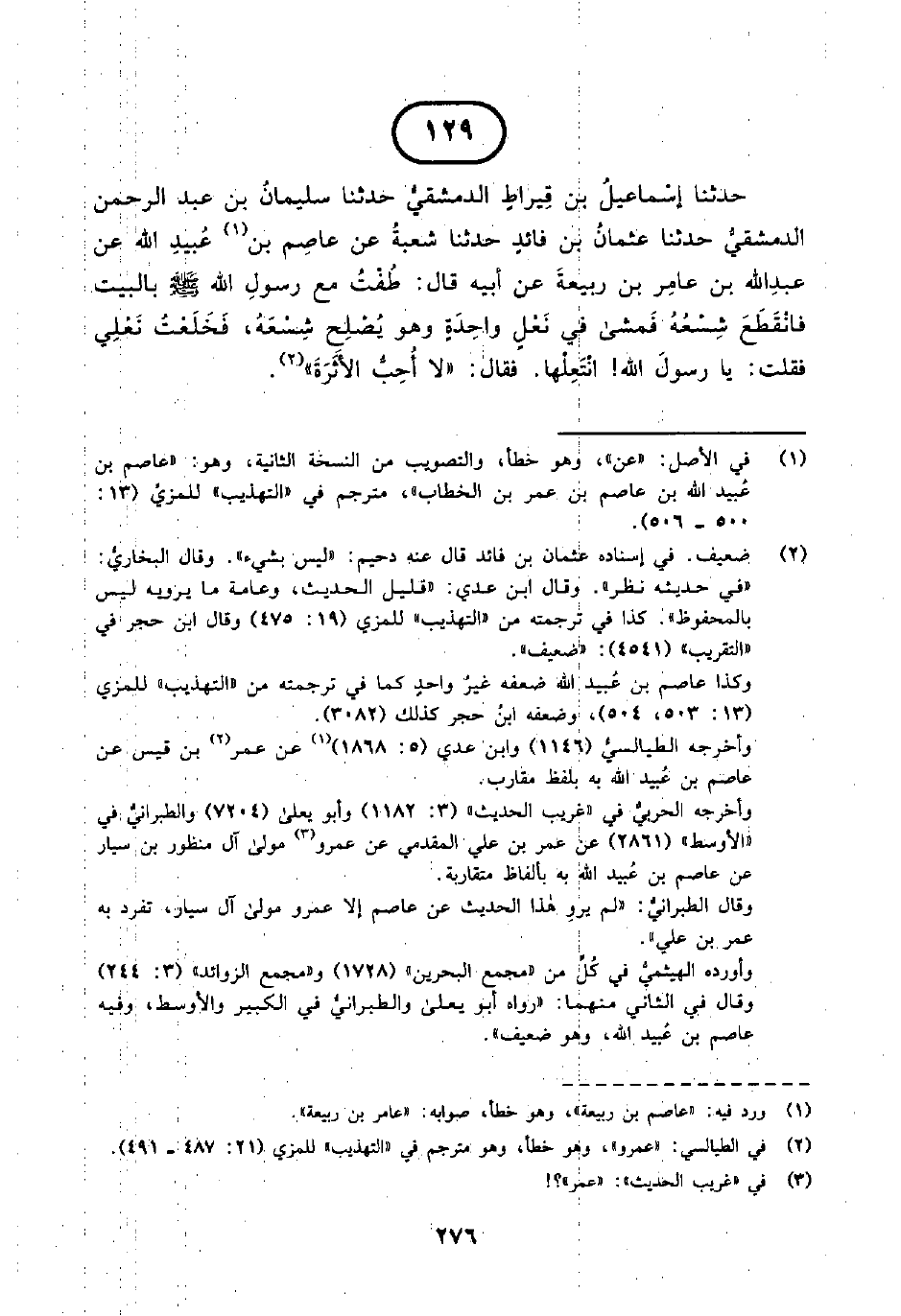 129 - حَدَّثَنَا إِسْمَاعِيلُ بْنُ قِيرَاطٍ الدِّمَشْقِيُّ حَدَّثَنَا سُلَيْمَانُ بْنُ عَبْدِ الرَّحْمَنِ الدِّمَشْقِيُّ حَدَّثَنَا عُثْمَانُ بْنُ فَائِدٍ حَدَّثَنَا شُعْبَةُ عَنْ عَاصِمِ بْنِ عُبَيْدِ اللَّهِ عَنْ عَبْدِ اللَّهِ بْنِ عَامِرِ بْنِ رَبِيعَةَ عَنْ أَبِيهِ قَالَ طُفْتُ مَعَ رَسُولِ اللَّهِ صَلَّى اللَّهُ عَلَيْهِ وَسَلَّمَ بِالْبَيْتِ فَانْقَطَعَ شِسْعُهُ فَمَشَى فِي نَعْلٍ وَاحِدَةٍ وَهُوَ يُصْلِحُ شِسْعَهُ فَخَلَعْتُ نَعْلِي فَقُلْتُ يَا رَسُولَ اللَّهِ انْتَعِلْهَا فَقَالَ لَا أُحِبُّ الْأَثَرَةَ.