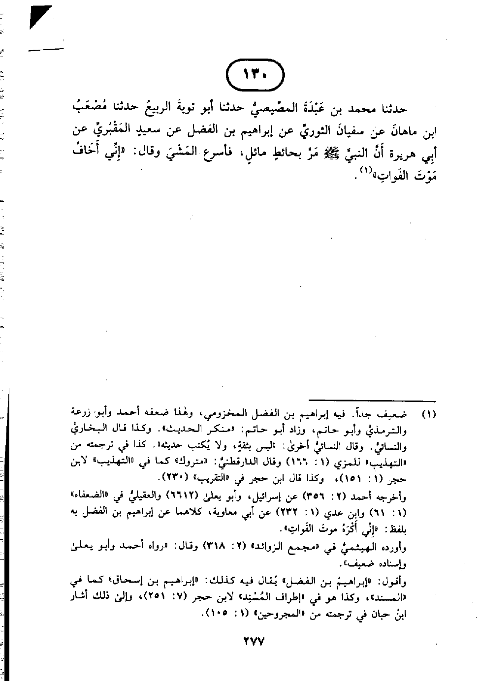 130 - حَدَّثَنَا مُحَمَّدُ بْنُ عَبْدَةَ الْمِصِّيصِيُّ حَدَّثَنَا أَبُو تَوْبَةَ الرَّبِيعُ حَدَّثَنَا مُصْعَبُ بْنُ مَاهَانَ عَنْ سُفْيَانَ الثَّوْرِيِّ عَنْ إِبْرَاهِيمَ بْنِ الْفَضْلِ عَنْ سَعِيدٍ الْمَقْبُرِيِّ عَنْ أَبِي هُرَيْرَةَ أَنَّ النَّبِيَّ صَلَّى اللَّهُ عَلَيْهِ وَسَلَّمَ مَرَّ بِحَائِطٍ مَائِلٍ فَأَسْرَعَ الْمَشْيَ وَقَالَ إِنِّي أَخَافُ مَوْتَ الْفَوَاتِ.