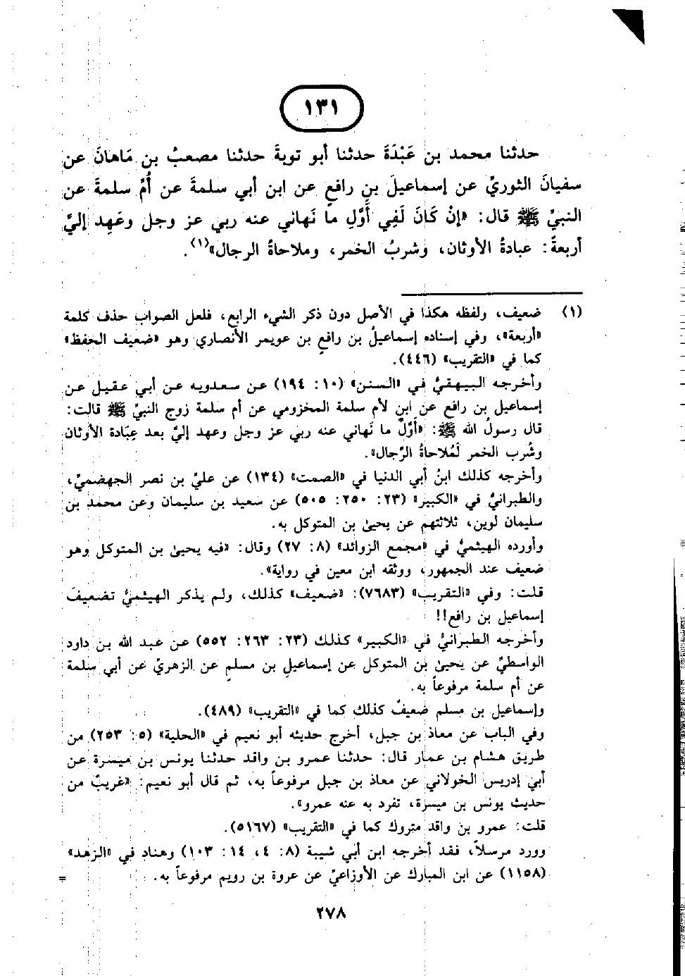 131 - حَدَّثَنَا مُحَمَّدُ بْنُ عَبْدَةَ حَدَّثَنَا أَبُو تَوْبَةَ حَدَّثَنَا مُصْعَبُ بْنُ مَاهَانَ عَنْ سُفْيَانَ الثَّوْرِيِّ عَنْ إِسْمَاعِيلَ بْنِ رَافِعٍ عَنِ ابْنِ أَبِي سَلَمَةَ عَنْ أُمِّ سَلَمَةَ عَنِ النَّبِيِّ صَلَّى اللَّهُ عَلَيْهِ وَسَلَّمَ قَالَ إِنْ كَانَ لَفِي أَوَّلِ مَا نَهَانِي عَنْهُ رَبِّي عَزَّ وَجَلَّ وَعَهِدَ إِلَيَّ أَرْبَعَةٌ: عِبَادَةُ الْأَوْثَانِ وَشُرْبُ الْخَمْرِ وَمُلَاحَاةُ الرِّجَالِ.