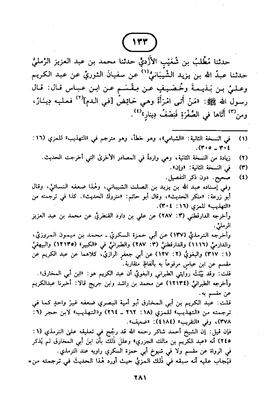 133 - حَدَّثَنَا مُطَّلِبُ بْنُ شُعَيْبٍ الْأَزْدِيُّ حَدَّثَنَا مُحَمَّدُ بْنُ عَبْدِ الْعَزِيزِ الرَّمْلِيُّ حَدَّثَنَا عَبْدُ اللَّهِ بْنُ يَزِيدَ الشَّيْبَانِيُّ عَنْ سُفْيَانَ الثَّوْرِيِّ عَنْ عَبْدِ الْكَرِيمِ وَعَلِيِّ بْنِ بَذِيمَةَ وَخُصَيْفٍ عَنْ مِقْسَمٍ عَنِ ابْنِ عَبَّاسٍ قَالَ قَالَ رَسُولُ اللَّهِ صَلَّى اللَّهُ عَلَيْهِ وَسَلَّمَ مَنْ أَتَى امْرَأَةً وَهِيَ حَائِضٌ [فِي الدَّمِ] فَعَلَيْهِ دِينَارٌ وَمَنْ أَتَاهَا فِي الصُّفْرَةِ فَنِصْفُ دِينَارٍ.