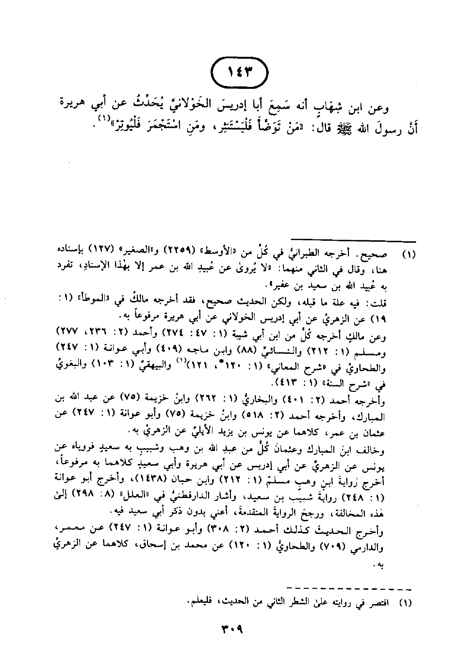 143 - وَعَنِ ابْنِ شِهَابٍ أَنَّهُ سَمِعَ أَبَا إِدْرِيسَ الْخَوْلَانِيَّ يُحَدِّثُ عَنْ أَبِي هُرَيْرَةَ أَنَّ رَسُولَ اللَّهِ صَلَّى اللَّهُ عَلَيْهِ وَسَلَّمَ قَالَ مَنْ تَوَضَّأَ فَلْيَسْتَنْثِرْ ومَنِ اسْتجْمَرَ فَلْيُوتِرْ.