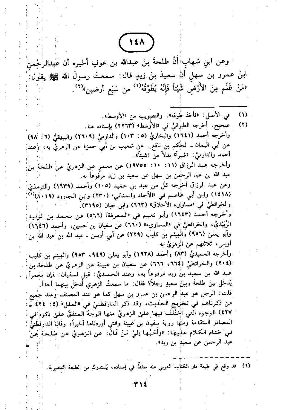 148 - وَعَنِ ابْنِ شِهَابٍ أَنَّ طَلْحَةَ بْنَ عَبْدِ اللَّهِ بْنِ عَوْفٍ أَخْبَرَهُ أَنَّ عَبْدَ الرَّحْمَنِ بْنَ عَمْرِو بْنِ سَهْلٍ أَنَّ سَعِيدَ بْنَ زَيْدٍ قَالَ سَمِعْتُ رَسُولَ اللَّهِ صَلَّى اللَّهُ عَلَيْهِ وَسَلَّمَ يَقُولُ مَنْ ظَلَمَ مِنَ الْأَرْضِ شَيْئًا فَإِنَّهُ يُطَوَّقُهُ مْنِ سَبْعِ أَرَضِينَ.