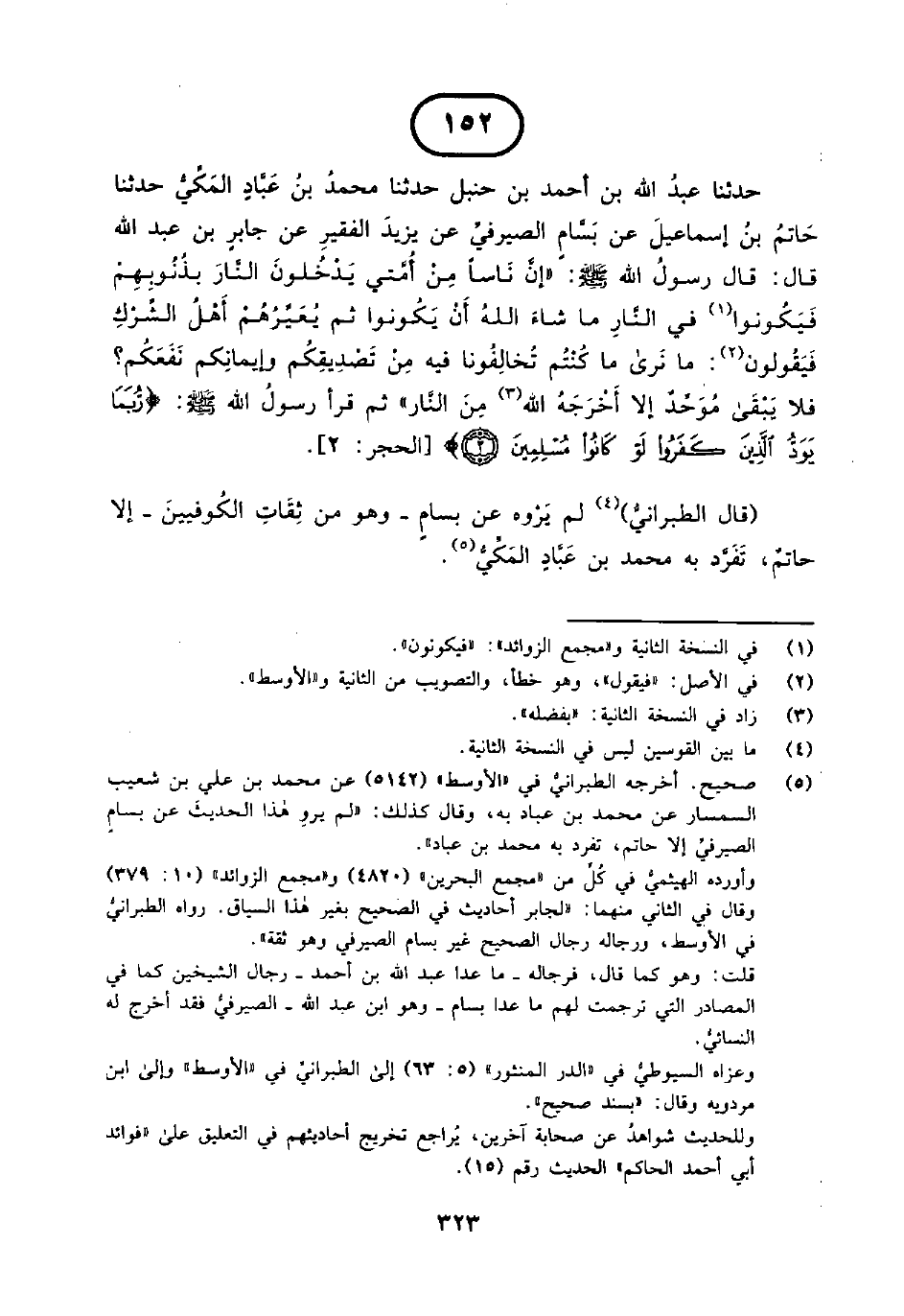 152 - حَدَّثَنَا عَبْدُ اللَّهِ بْنُ أَحْمَدَ بْنِ حَنْبَلٍ حَدَّثَنَا مُحَمَّدُ بْنُ عَبَّادٍ الْمَكِّيُّ حَدَّثَنَا حَاتِمُ بْنُ إِسْمَاعِيلَ عَنْ بَسَّامٍ الصَّيْرَفِيِّ عَنْ يَزِيدَ الْفَقِيرِ عَنْ جَابِرِ بْنِ عَبْدِ اللَّهِ قَالَ قَالَ رَسُولُ اللَّهِ صَلَّى اللَّهُ عَلَيْهِ وَسَلَّمَ إِنَّ نَاسًا مِنْ أُمَّتِي يَدْخُلُونَ النار بذنوبهم فيكونوا فِي النَّارِ مَا شَاءَ اللَّهُ أَنْ يَكُونُوا ثُمَّ يُعَيِّرُهُمْ أَهْلُ الشِّرْكِ فَيَقُولُونَ مَا نَرَى مَا كُنْتُمْ تُخَالِفُونَا فِيهِ مِنْ تَصْديِقِكُمْ وَإِيمَانِكُمْ نَفَعَكُمْ فَلَا يَبْقَى مُوَحِّدٌ إِلَّا أَخْرَجَهُ اللَّهُ مِنَ النَّارِ ثُمَّ قَرَأَ رَسُولُ اللَّهِ صَلَّى اللَّهُ عَلَيْهِ وَسَلَّمَ: (رُبَمَا يَوَدُّ الَّذِينَ كَفَرُوا لَوْ كَانُوا مُسْلِمِينَ). قَالَ الطَّبَرَانِيُّ لَمْ يَرْوِهِ عَنْ بَسَّامٍ وَهُوَ مِنْ ثِقَاتِ الْكُوفِيِّينَ إِلَّا حَاتِمٌ تَفَرَّدَ بِهِ مُحَمَّدُ بْنُ عَبَّادٍ الْمَكِّيُّ.
