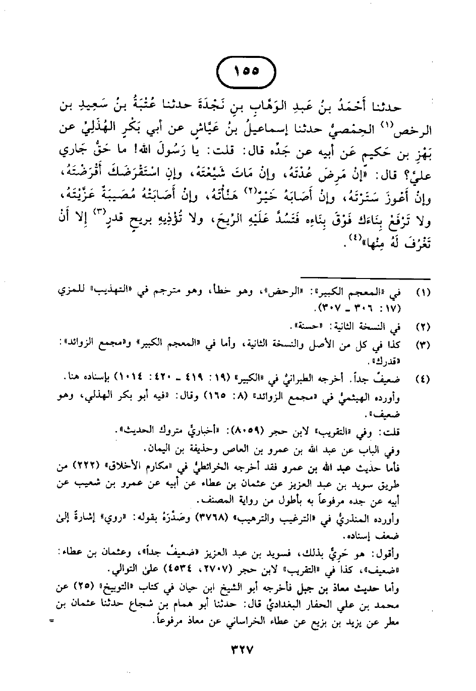 155 - حَدَّثَنَا أَحْمَدُ بْنُ عَبْدِ الْوَهَّابِ بْنِ نَجْدَةَ حَدَّثَنَا عُتْبَةُ بْنُ سَعِيدِ بْنِ الرَّخْصِ الْحِمْصِيُّ حَدَّثَنَا إِسْمَاعِيلُ بْنُ عَيَّاشٍ عَنْ أَبِي بَكْرٍ الْهُذَلِيِّ عَنْ بَهْزِ بْنِ حَكِيمِ عَنْ أَبِيهِ عَنْ جَدِّهِ قَالَ قُلْتُ يَا رَسُولَ اللَّهِ مَا حَقُّ جَارِي عَلَيَّ قَالَ إِنْ مَرِضَ عُدْتَهُ وَإِنْ مَاتَ شَيَّعْتَهُ وَإِنِ اسْتَقْرَضَكَ أَقْرَضْتَهُ وَإِنْ أَعْوَزَ سَتَرْتَهُ وَإِنْ أَصَابَهُ خَيْرٌ هَنَّأْتَهُ وَإِنْ أَصَابَتْهُ مُصِيبَةٌ عَزَّيْتَهُ ولا ترفع بناءك فوق بناءه فَتَسُدَّ عَلَيْهِ الرِّيحَ وَلَا تُؤْذِيهِ بِرِيحِ قِدْرٍ إِلَّا أَنْ تَغْرُفَ لَهُ مِنْهَا.