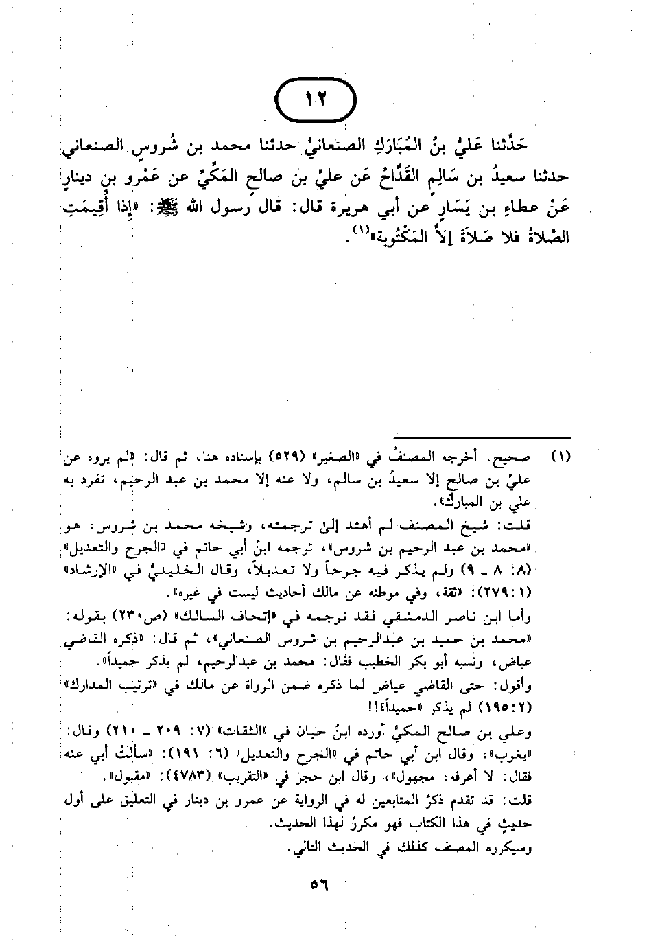 12 - حَدَّثَنَا عَلِيُّ بْنُ الْمُبَارَكِ الصَّنْعَانِيُّ حَدَّثَنَا مُحَمَّدُ بْنُ شُرُوسٍ الصَّنْعَانِيُّ حَدَّثَنَا سَعِيدُ بْنُ سَالِمٍ الْقَدَّاحُ عَنْ عَلِيِّ بْنِ صَالِحٍ الْمَكِّيِّ عَنْ عَمْرِو بْنِ دِينَارٍ عَنْ عَطَاءِ بْنِ يَسَارٍ عَنْ أَبِي هُرَيْرَةَ قَالَ قَالَ رَسُولُ اللَّهِ صَلَّى اللَّهُ عَلَيْهِ وَسَلَّمَ إِذَا أُقِيمَتِ الصَّلَاةُ فَلَا صَلَاةَ إِلَّا الْمَكْتُوبَةُ.