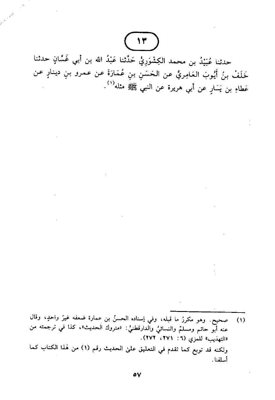 13 - حَدَّثَنَا عُبَيْدُ بْنُ مُحَمَّدٍ الْكَشُورِيُّ حَدَّثَنَا عَبْدُ اللَّهِ بْنُ أَبِي غَسَّانَ حَدَّثَنَا خَلَفُ بْنُ أَيُّوبَ الْعَامِرِيُّ عَنِ الْحَسَنِ بْنِ عُمَارَةَ عَنْ عَمْرِو بْنِ دِينَارٍ عَنْ عَطَاءِ بْنِ يَسَارٍ عَنْ أَبِي هُرَيْرَةَ عَنِ النَّبِيِّ صَلَّى اللَّهُ عَلَيْهِ وَسَلَّمَ مِثْلَهُ.