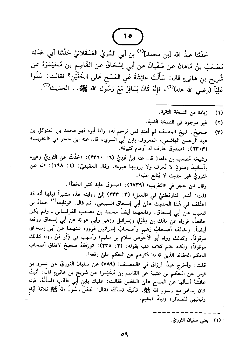 15 - حَدَّثَنَا عَبْدُ اللَّهِ [بْنُ مُحَمَّدِ] بْنِ أَبِي السَّرِيِّ العَسْقَلَانِيُّ حَدَّثَنَا أَبِي حَدَّثَنَا مُصْعَبُ بْنُ مَاهَانَ عَنْ سُفْيَانَ عَنْ أَبِي إِسْحَاقَ عَنِ الْقَاسِمِ بْنِ مُخَيْمَرَةَ عَنْ شُرَيْحِ بْنِ هَانِئٍ قَالَ سَأَلْتُ عَائِشَةَ عَنِ الْمَسْحِ عَلَى الْخُفَّيْنِ فَقَالَتْ سَلُوا عَلِيًّا رَضِيَ اللَّهُ عَنْهُ فَإِنَّهُ كَانَ يُسَافِرُ مَعَ رَسُولُ اللَّهِ صَلَّى اللَّهُ عَلَيْهِ وَسَلَّمَ ... الْحَدِيثُ.