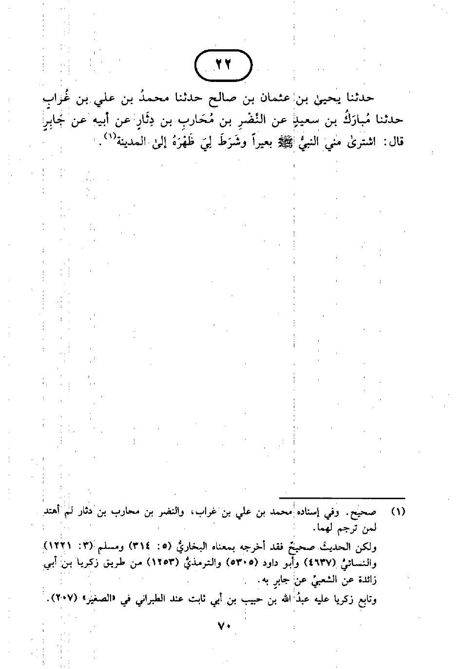 22 - حَدَّثَنَا يَحْيَى بْنُ عُثْمَانَ بْنِ صَالِحٍ حَدَّثَنَا مُحَمَّدُ بْنُ عَلِيِّ بْنِ غُرَابٍ حَدَّثَنَا مُبَارَكُ بْنُ سَعِيدٍ عَنِ النَّضْرِ بْنِ مُحَارِبِ بْنِ دِثَارٍ عَنْ أَبِيهِ عَنْ جَابِرٍ قَالَ اشْتَرَى مِنِّي النَّبِيُّ صَلَّى اللَّهُ عَلَيْهِ وَسَلَّمَ بَعِيرًا وَشَرَطَ لِيَ ظَهْرَهُ إِلَى الْمَدِينَةِ.
