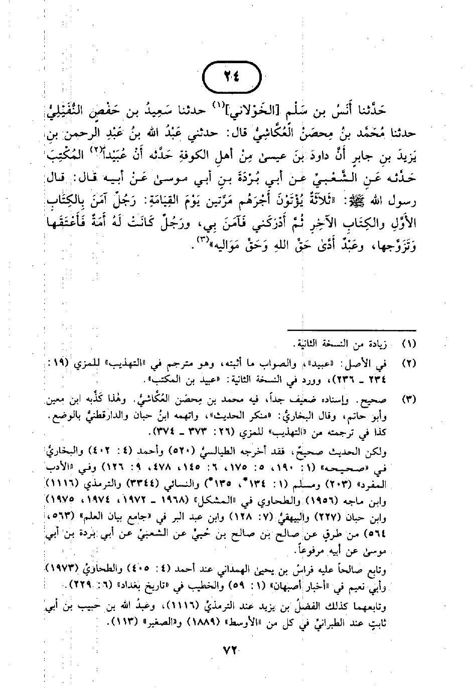 24 - حَدَّثَنَا أَنَسُ بْنُ سَلْمٍ [الْخَوْلَانِيُّ] حَدَّثَنَا سَعِيدُ بْنُ حَفْصٍ النُّفَيْلِيُّ حَدَّثَنَا مُحَمَّدُ بْنُ مِحْصَنٍ الْعُكَّاشِيُّ قَالَ حَدَّثَنِي عَبْدُ اللَّهِ بْنُ عَبْدِ الرَّحْمَنِ بْنُ يَزِيدَ بْنِ جَابَرٍ أَنَّ دَاوُدَ بْنَ عِيسَى مِنْ أَهْلِ الْكُوفَةِ حَدَّثَهُ أَنَّ عُبَيْدًا الْمُكْتِبَ حَدَّثَهُ عَنِ الشَّعْبِيِّ عَنْ أَبِي بُرْدَةَ بْنِ أَبِي مُوسَى عَن أَبِيهِ قَالَ قَالَ رَسُولُ اللَّهِ صَلَّى اللَّهُ عَلَيْهِ وَسَلَّمَ ثَلَاثَةٌ يُؤْتَوْنَ أَجْرَهُمْ مَرَّتَيْنِ يَوْمَ الْقِيَامَةِ رَجُلٌ آمَنَ بِالْكِتَابِ الْأَوَّلِ وَالْكِتَابِ الْآخِرِ ثُمَّ أَدْرَكَنِي فَآمَنَ بِي وَرَجُلٌ كانت لَهُ أَمَةٌ فَأَعْتَقَهَا وَتَزَوَّجَهَا وَعَبْدٌ أَدَّى حَقَّ اللَّهِ وَحَقَّ مَوَالِيهِ.