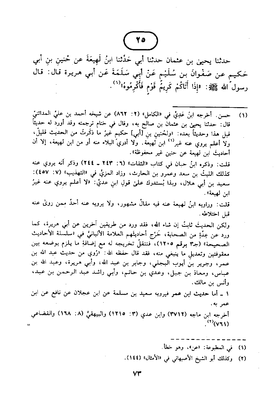 25 - حَدَّثَنَا يَحْيَى بْنُ عُثْمَانَ حَدَّثَنَا أَبِي حَدَّثَنَا ابْنُ لَهِيعَةَ عَنْ حُنَيْنِ بْنِ أَبِي حَكِيمٍ عَنْ صَفْوَانَ بْنِ سُلَيْمٍ عَنْ أَبِي سَلَمَةَ عَنْ أَبِي هُرَيْرَةَ قَالَ قَالَ رَسُولُ اللَّهِ صَلَّى اللَّهُ عَلَيْهِ وَسَلَّمَ إِذَا أَتَاكُمْ كَرِيمُ قَوْمٍ فَأَكْرِمُوهُ