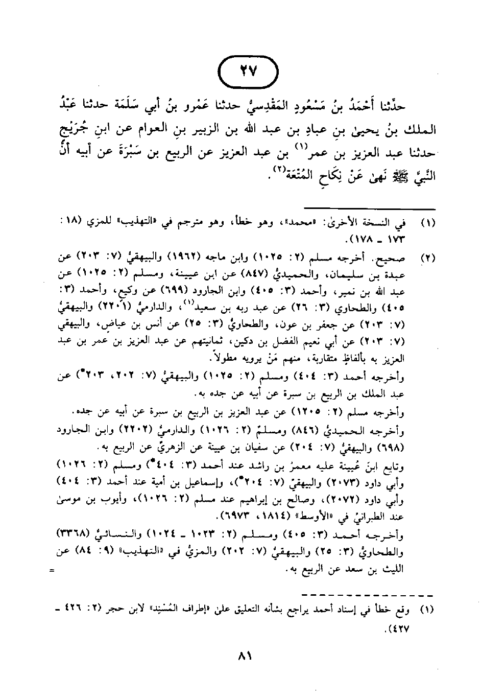 27 - حَدَّثَنَا أَحْمدُ بْنُ مَسْعُودٍ الْمَقْدِسِيُّ حَدَّثَنَا عَمْرُو بْنُ أَبِي سَلَمَةَ حَدَّثَنَا عَبْدُ الْمَلِكِ بْنُ يَحْيَى بْنِ عَبَّادِ بْنِ عَبْدِ اللَّهِ بْنِ الزُّبَيْرِ بْنِ الْعَوَّامِ عَنِ ابْنِ جُرَيْجٍ حَدَّثَنَا عَبْدُ الْعَزِيزِ بْنُ عُمَرَ بْنِ عَبْدِ الْعَزِيزِ عَنِ الرَّبِيعِ بْنِ سَبْرَةَ عَنْ أَبِيهِ أَنَّ النَّبِيَّ صَلَّى اللَّهُ عَلَيْهِ وَسَلَّمَ نَهَى عَنْ نِكَاحِ الْمُتْعَةِ.
