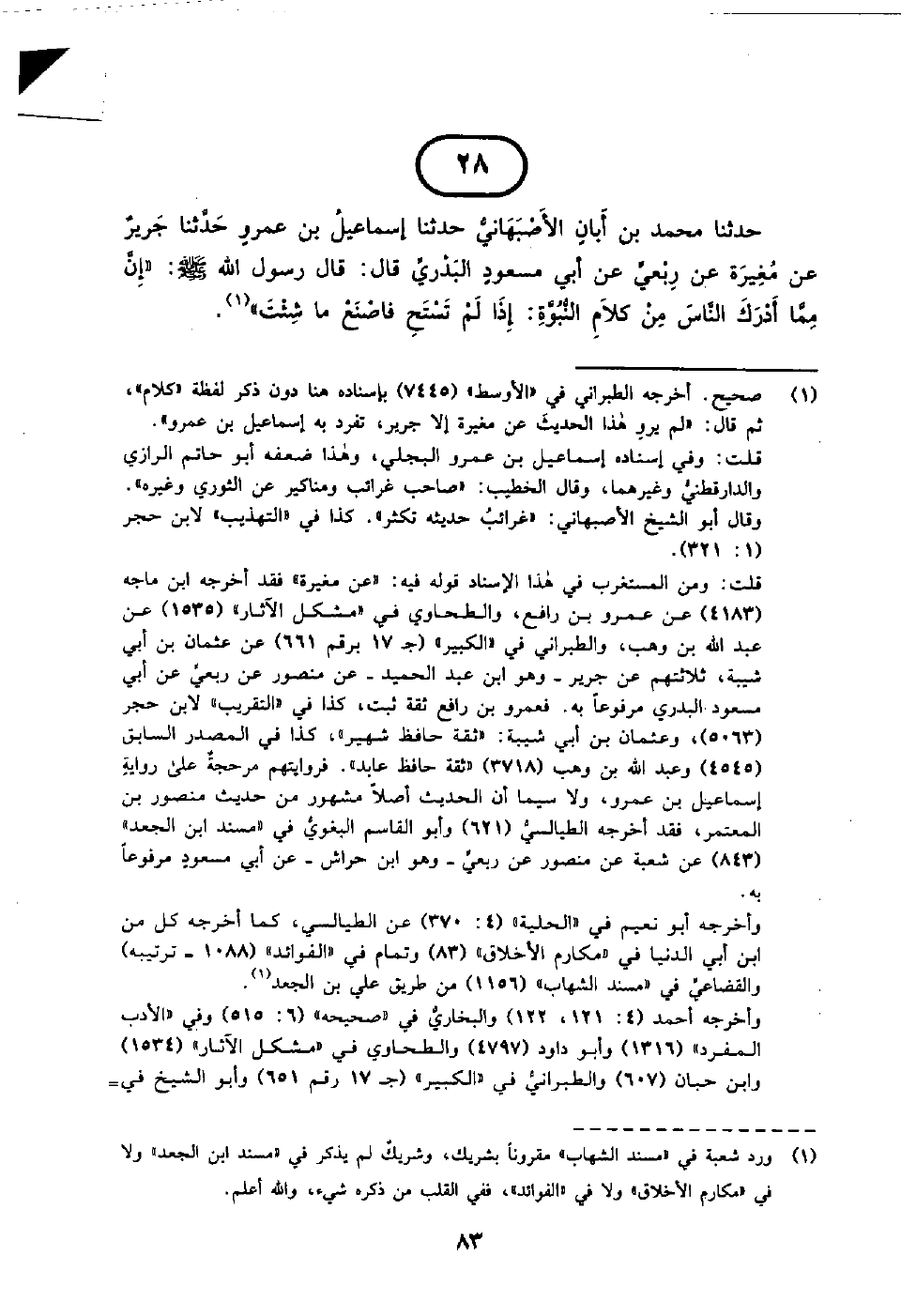 28 - حَدَّثَنَا مُحَمَّدُ بْنُ أَبَانَ الْأَصْبَهَانِيُّ حَدَّثَنَا إِسْمَاعِيلُ بْنُ عَمْرٍو حَدَّثَنَا جَرِيرٌ عَنْ مُغِيرَةَ عَنْ رِبْعِيٍّ عَنْ أَبِي مَسْعُودٍ الْبَدْرِيِّ قَالَ قَالَ رَسُولُ اللَّهِ صَلَّى اللَّهُ عَلَيْهِ وَسَلَّمَ إِنَّ مِمَّا أَدْرَكَ النَّاسَ مِنْ كَلَامِ النُّبُوَّةِ إِذَا لَمْ تَسْتَحِ فَاصْنَعْ مَا شِئْتَ.