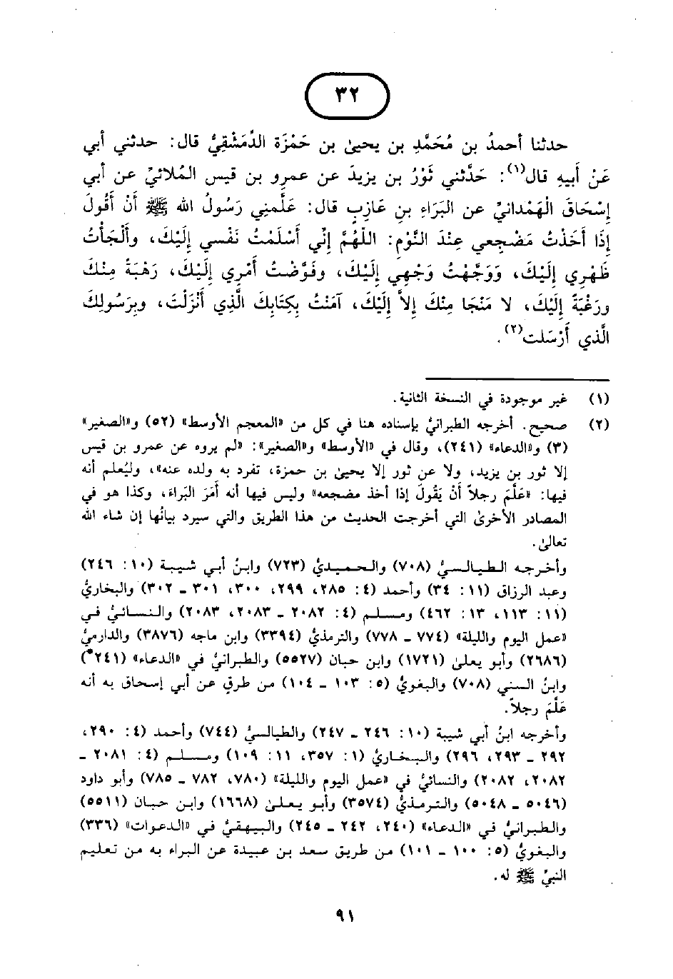 32 - حَدَّثَنَا أَحْمَدُ بْنُ مُحَمَّدِ بْنِ يَحْيَى بْنِ حَمْزَةَ الدِّمَشْقِيُّ قَالَ حَدَّثَنِي أَبِي عَنْ أَبِيهِ قَالَ حدثنا ثَوْرُ بْنُ يَزِيدَ عَنْ عَمْرِو بْنِ قَيْسٍ الْمُلَائِيِّ عَنْ أَبِي إِسْحَاقَ الْهَمْدَانِيِّ عَنِ الْبَرَاءِ بْنِ عَازِبٍ قَالَ عَلَّمَنِي رَسُولُ اللَّهِ صَلَّى اللَّهُ عَلَيْهِ وَسَلَّمَ إِنَّ أَقُولَ إِذَا أَخَذْتُ مَضْجَعِي عِنْدَ النوم اللهم إن أَسْلَمْتُ نَفْسِي إِلَيْكَ وَأَلْجَأْتُ ظَهْرِي إِلَيْكَ وَوَجَّهْتُ وَجْهِي إِلَيْكَ وَفَوَّضْتُ أَمْرِي إِلَيْكَ رَهْبَةً مِنْكَ وَرَغْبَةً إليك لا منجا منك إلا إليك آمنت بكاتبك الَّذِي أَنْزَلْتَ وَبِرَسُولِكَ الَّذِي أَرْسَلْتَ.