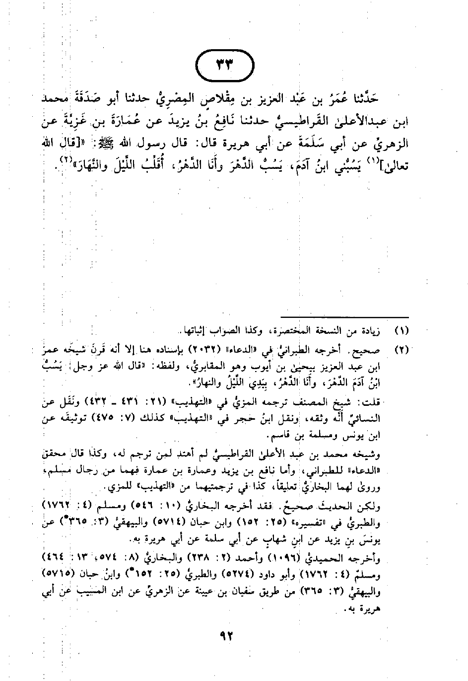 33 - حَدَّثَنَا عُمَرُ بْنُ عَبْدِ الْعَزِيزِ بْنُ مِقْلَاصٍ الْمِصْرِيُّ حَدَّثَنَا أَبُو صَدَقَةَ مُحَمَّدُ بْنُ عْبَدِ الْأَعْلَى الْقَرَاطِيسِيُّ حَدَّثَنَا نَافِعُ بْنُ يَزِيدَ عَنْ عُمَارَةَ بْنِ غَزِيَّةَ عَنِ الزُّهْرِيِّ عَنْ أَبِي سَلَمَةَ عَنْ أَبِي هُرَيْرَةَ قَالَ قَالَ رَسُولُ اللَّهِ صَلَّى اللَّهُ عَلَيْهِ وَسَلَّمَ [قَالَ اللَّهُ تَعَالَى] يَسُبُّنِي ابْنُ آدَمَ يَسُبُّ الدَّهْرَ وَأَنَا الدَّهْرُ أُقَلِّبُ اللَّيْلَ وَالنَّهَارَ.