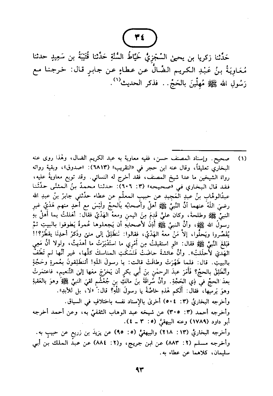34 - حَدَّثَنَا زَكَرِيَّا بْنُ يَحْيَى السَّجْزِيُّ خَيَّاطُ السُّنَّةِ حَدَّثَنَا قُتَيْبَةُ بْنُ سَعِيدٍ حَدَّثَنَا مُعَاوِيَةُ بْنُ عَبْدِ الْكَرِيمِ الضَّالُّ عَنْ عَطَاءٍ عَنْ جَابِرٍ قَالَ خَرَجْنَا مَعَ رَسُولِ اللَّهِ صَلَّى اللَّهُ عَلَيْهِ وَسَلَّمَ مُهِلِّينَ بِالْحَجِّ ... فَذَكَرَ الْحَدِيثَ.