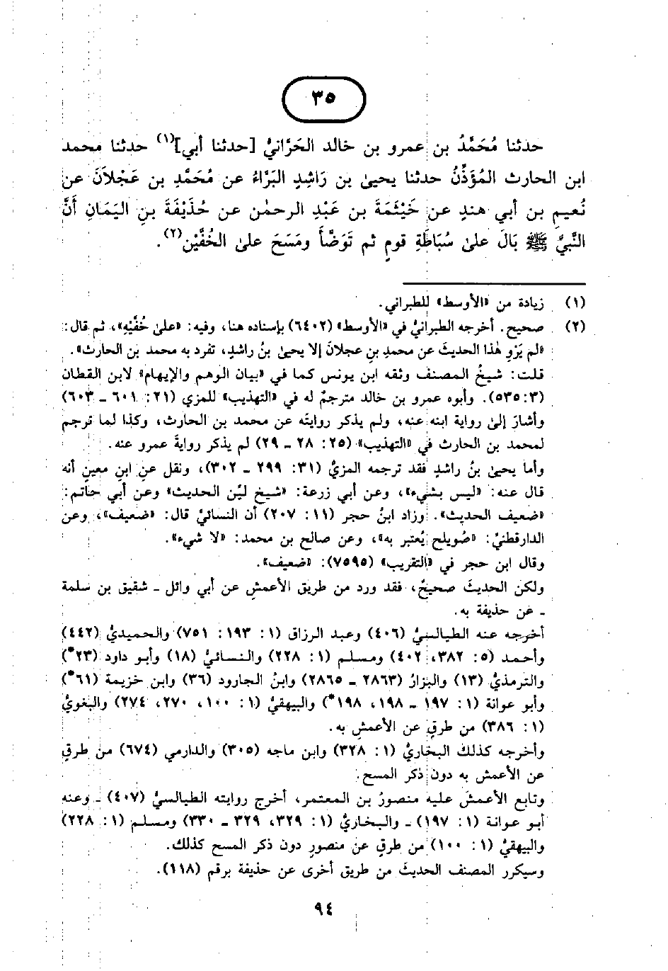 35 - حَدَّثَنَا مُحَمَّدُ بْنُ عَمْرِو بْنِ خَالِدٍ الْحَرَّانِيُّ [حَدَّثَنَا أَبِي] حَدَّثَنَا مُحَمَّدُ بْنُ الْحَارِثِ الْمُؤَذِّنُ حَدَّثَنَا يَحْيَى بْنُ رَاشِدٍ الْبَرَّاءُ عَنْ مُحَمَّدِ بْنِ عَجْلَانَ عَنْ نُعَيْمِ بْنِ أَبِي هِنْدٍ عَنْ خَيْثَمَةَ بْنِ عَبْدِ الرَّحْمَنِ عَنْ حُذَيْفَةَ بْنِ الْيَمَانِ أَنَّ النَّبِيَّ صَلَّى اللَّهُ عَلَيْهِ وَسَلَّمَ بَالَ عَلَى سُبَاطَةِ قَوْمٍ ثُمَّ تَوَضَّأَ وَمَسَحَ عَلَى الْخُفَّيْنِ.