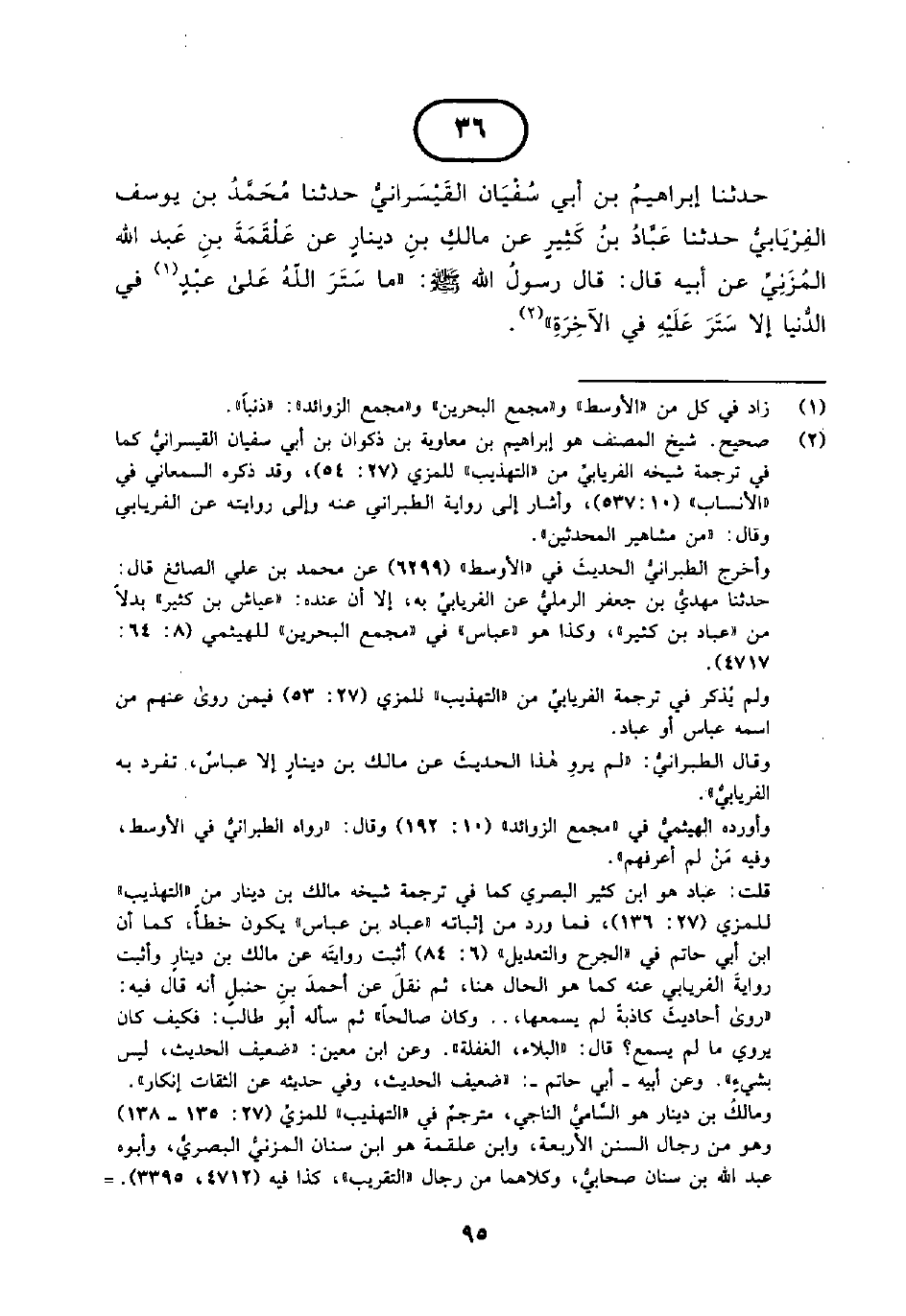 36 - حَدَّثَنَا إِبْرَاهِيمُ بْنُ أَبِي سُفْيَانَ الْقَيْسَرَانِيُّ حَدَّثَنَا مُحَمَّدُ بْنُ يُوسُفَ الْفِرْيَابِيُّ حَدَّثَنَا عَبَّادُ بْنُ كَثِيرٍ عَنْ مَالِكِ بْنِ دِينَارٍ عَنْ عَلْقَمَةَ بْنِ عَبْدِ اللَّهِ الْمُزَنِيِّ عَن أَبِيهِ قَالَ قَالَ رَسُولُ اللَّهِ صَلَّى اللَّهُ عَلَيْهِ وَسَلَّمَ مَا سَتَرَ اللَّهُ عَلَى عَبْدٍ فِي الدُّنْيَا إِلَّا سَتَرَ عَلَيْهِ فِي الْآخِرَةِ.