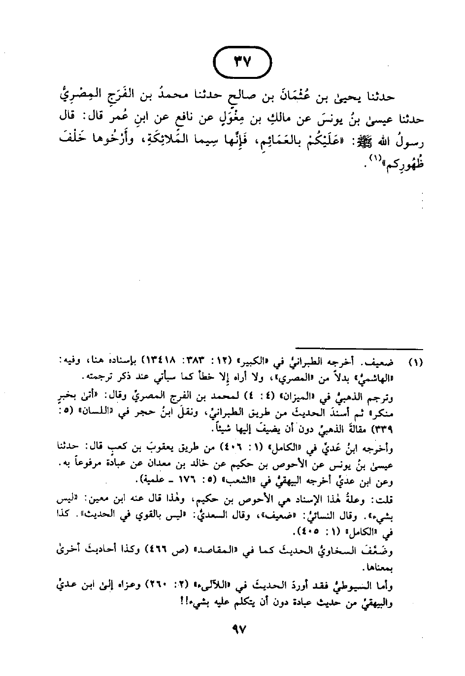 37 - حَدَّثَنَا يَحْيَى بْنُ عُثْمَانَ بْنِ صَالِحٍ حَدَّثَنَا مُحَمَّدُ بْنُ الْفَرَجِ الْمِصْرِيُّ حَدَّثَنَا عِيسَى بْنُ يُونُسَ عَنْ مَالِكِ بْنِ مِغْوَلٍ عَنْ نَافِعٍ عَنِ ابْنِ عُمَرَ قَالَ قَالَ رَسُولُ اللَّهِ صَلَّى اللَّهُ عَلَيْهِ وَسَلَّمَ عَلَيْكُمْ بِالْعَمَائِمِ فَإِنَّهَا سِيمَا الْمَلَائِكَةِ وَأَرْخُوهَا خَلْفَ ظُهْورِكُمْ.