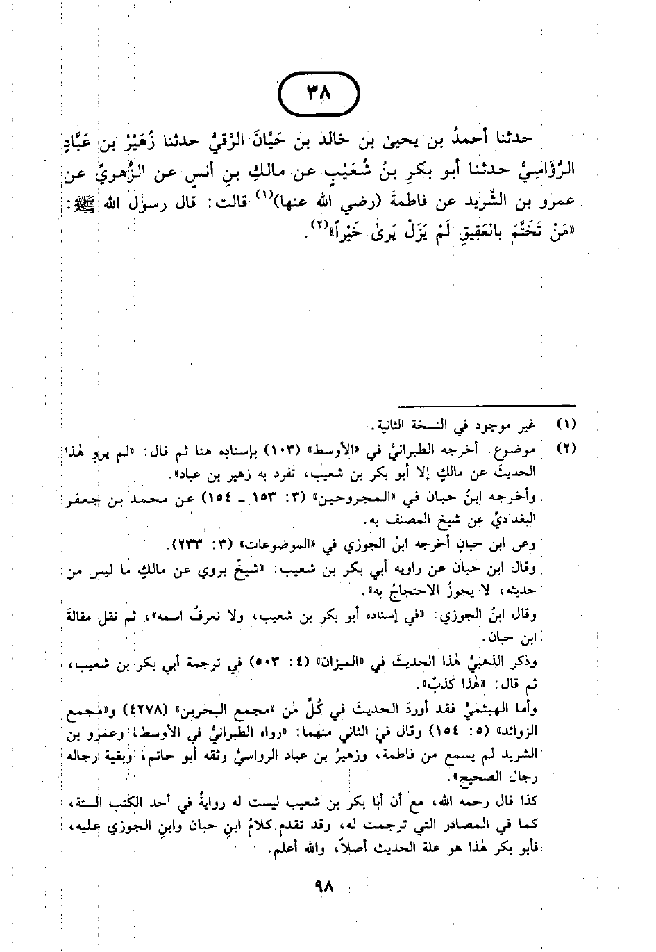 38 - حَدَّثَنَا أَحْمَدُ بْنُ يَحْيَى بْنِ خَالِدِ بْنِ حَيَّانَ الرَّقِّيُّ حَدَّثَنَا زُهَيْرُ بْنُ عَبَّادٍ الرُّؤَاسِيُّ حَدَّثَنَا أَبُو بَكْرِ بْنُ شُعَيْبٍ عَنْ مَالِكِ بْنِ أَنَسٍ عَنِ الزُّهْرِيِّ عَنْ عَمْرِو بْنِ الشَّرِيدِ عَنْ فَاطِمَةَ رَضِيَ اللَّهُ عَنْهَا قَالَتْ قَالَ رَسُولُ اللَّهِ صَلَّى اللَّهُ عَلَيْهِ وَسَلَّمَ مَنْ تَخَتَّمَ بِالْعَقِيقِ لَمْ يَزَلْ يَرَى خَيْرًا.