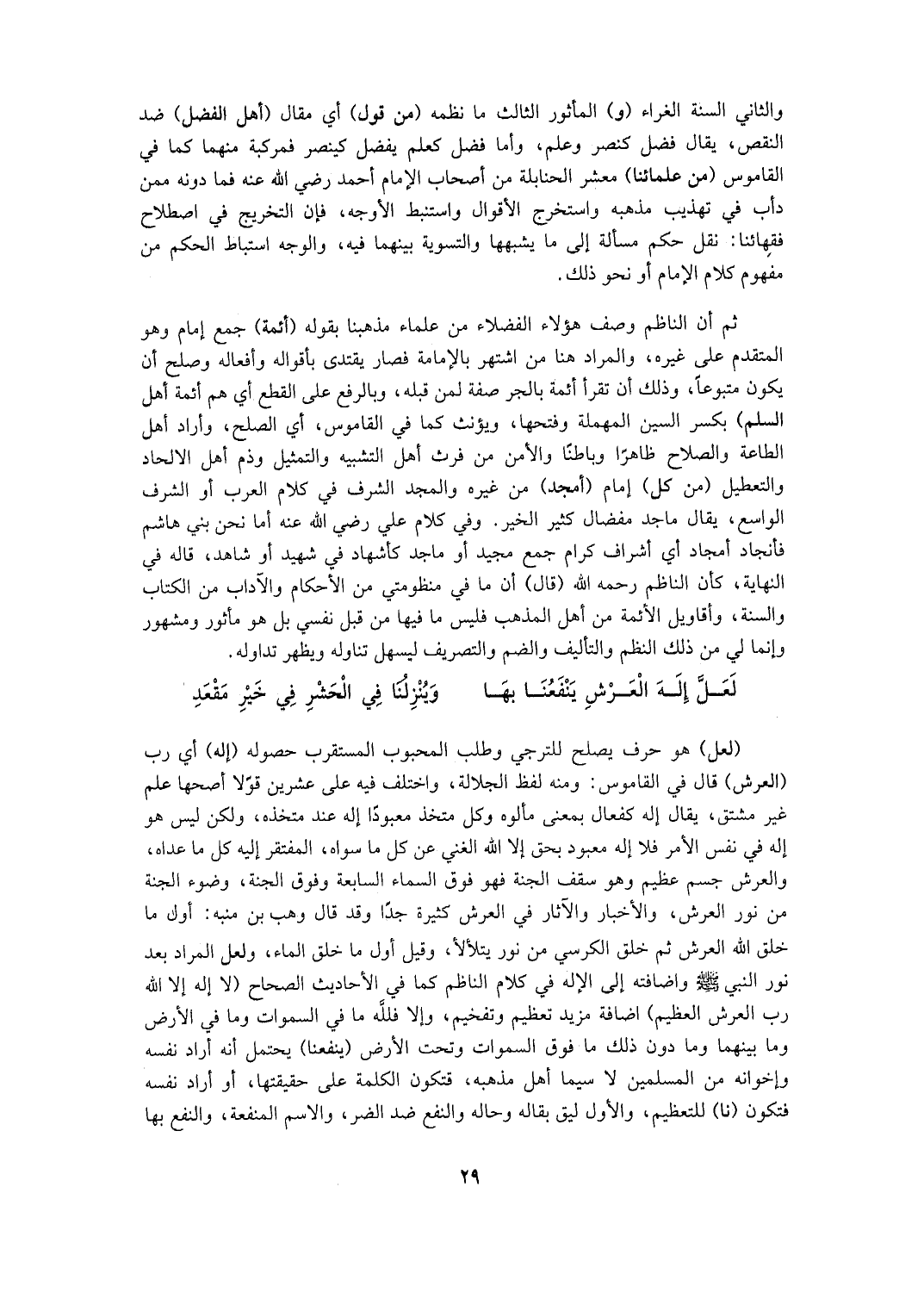 قَالَ وَلِلْجَمَادِ أَيْضًا هِدَايَةٌ تَلِيقُ بِهِ، كَمَا أَنَّ لِكُلِّ نَوْعٍ مِنْ الْحَيَوَانِ هِدَايَةً تَلِيقُ بِهِ وَإِنْ اخْتَلَفَتْ أَنْوَاعُهَا وَصُوَرُهَا، وَكَذَلِكَ لِكُلِّ عُضْوٍ هِدَايَةٌ تَلِيقُ بِهِ، فَهُدَى الرِّجْلَيْنِ لِلْمَشْيِ، وَاللِّسَانِ لِلْكَلَامِ، وَالْعَيْنِ لِكَشْفِ الْمَرْئِيَّاتِ، وَهَلُمَّ جَرًّا.