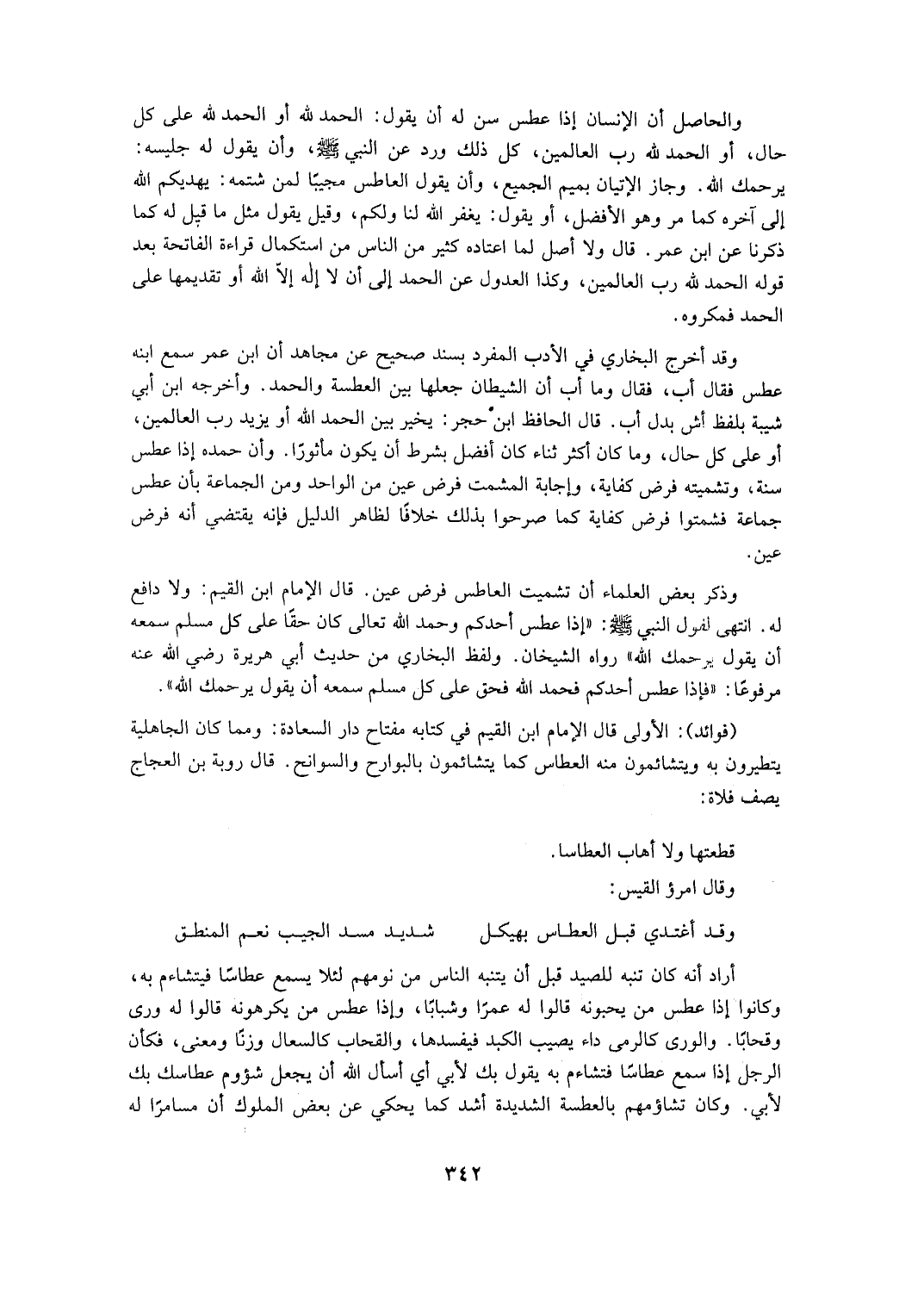 وَأَمَّا لَفْظُ الْحَدِيثِ فَهَذَا مَفْهُومُ عَدَدٍ وَقَدْ اخْتَلَفَ فِيهِ عُلَمَاءُ الْأُصُولِ هَلْ يَكُونُ مَفْهُومُهُ حُجَّةً أَوْ لَا الْأَكْثَرُ عَلَى أَنَّهُ لَا مَفْهُومَ لِلْعَدَدِ. وَأَيْضًا مُرَادُ النَّبِيِّ - صَلَّى اللهُ عَلَيْهِ وَسَلَّمَ - وَاَللَّهُ أَعْلَمُ أَنَّ الثَّلَاثَةَ أَقَلُّ مَا يُمْكِنُ انْفِرَادُ اثْنَيْنِ دُونَ وَاحِدٍ هَذَا مَا ظَهَرَ لِي الْآنَ وَاَللَّهُ وَلِيُّ الْإِحْسَانِ. ثُمَّ رَأَيْتُ الْحَافِظَ ابْنَ حَجَرٍ فِي شَرْحِ الْبُخَارِيِّ صَرَّحَ بِمَا قُلْنَا.